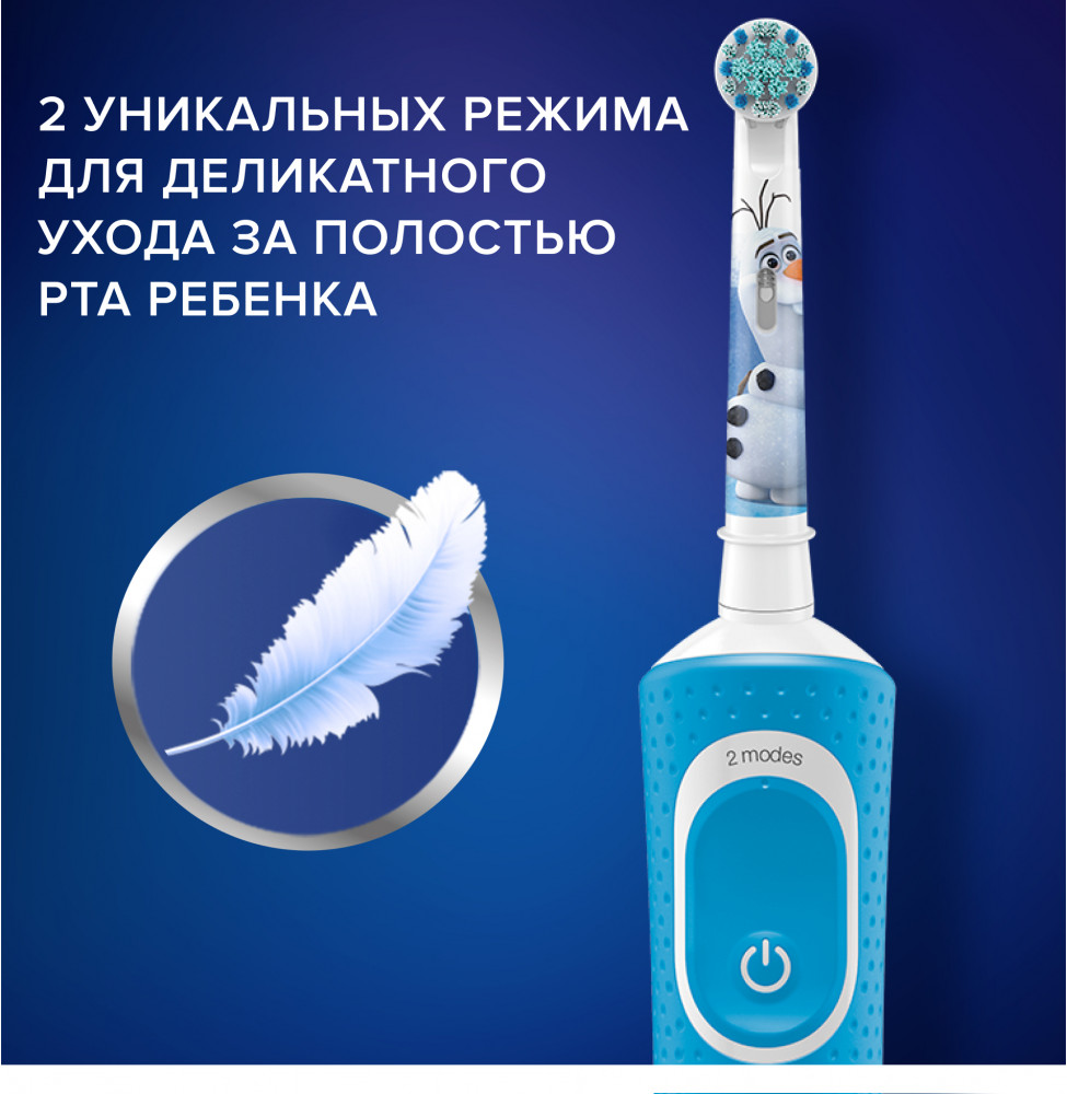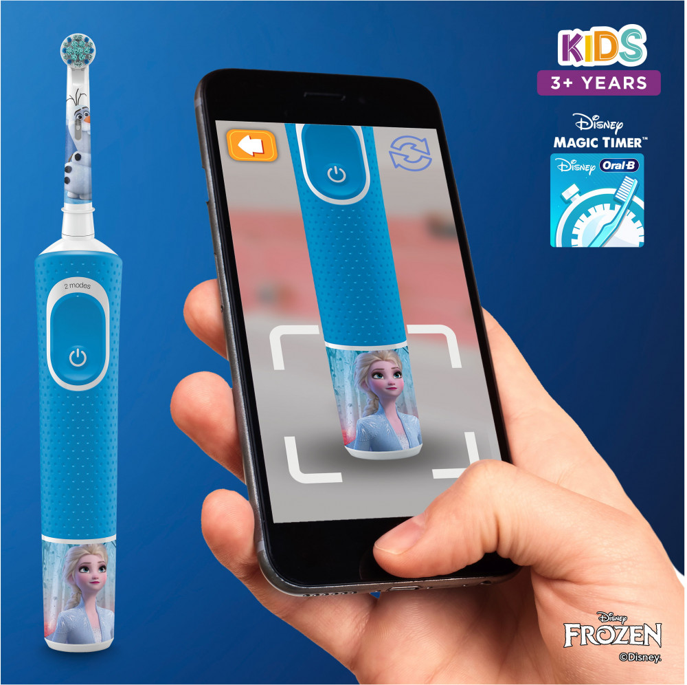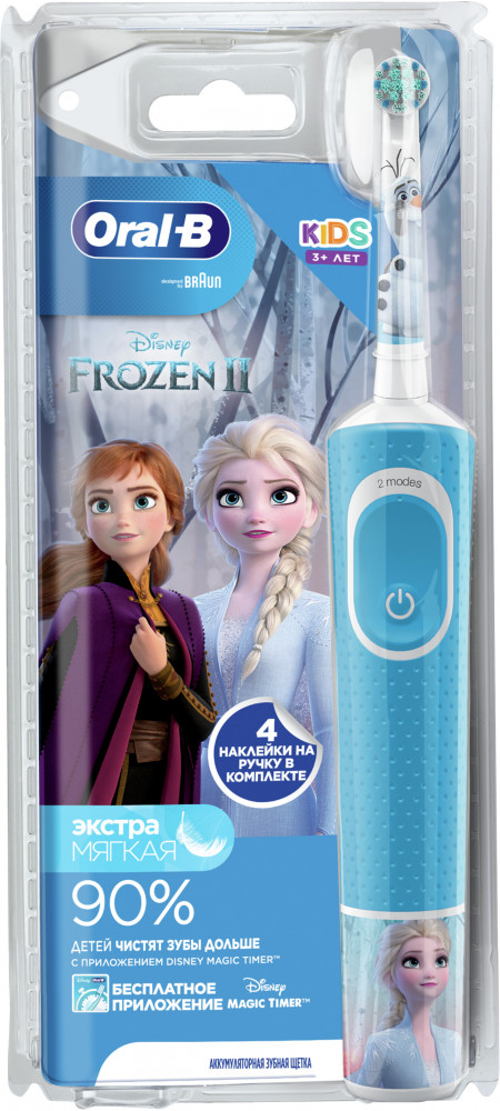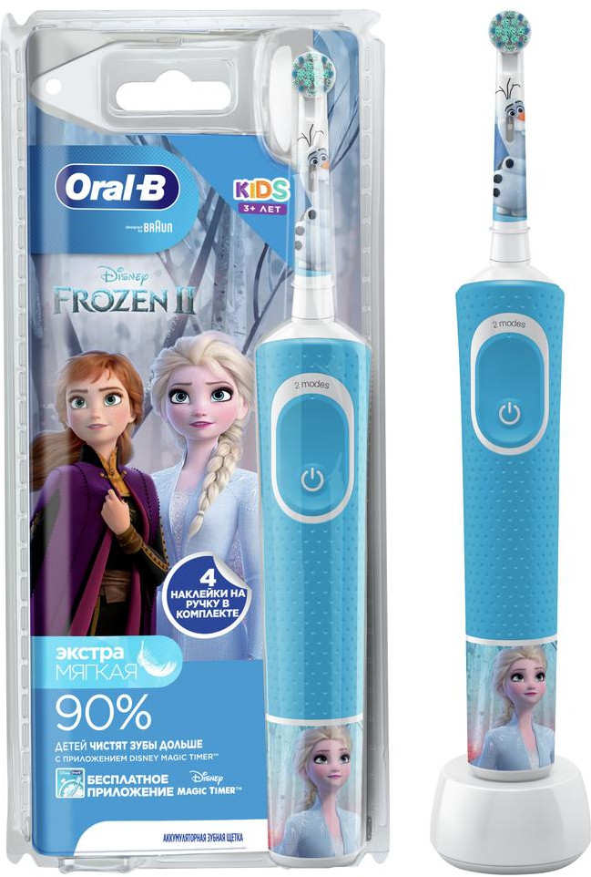 Детская электрическая зубная щетка Oral-B Kids для детей от 3 лет с любимыми героями мультфильма Disney «Холодное Сердце 2» поможет приучить ребенка к гигиене полости рта и сделает процесс увлекательнее. Зубная щетка имеет два режима специально для деликатного ухода за полостью рта ребенка. Дополнительный стимул для детей соблюсти рекомендации стоматологов по времени чистки — мобильное приложение, совместимое с зубной щеткой Oral-B Frozen.