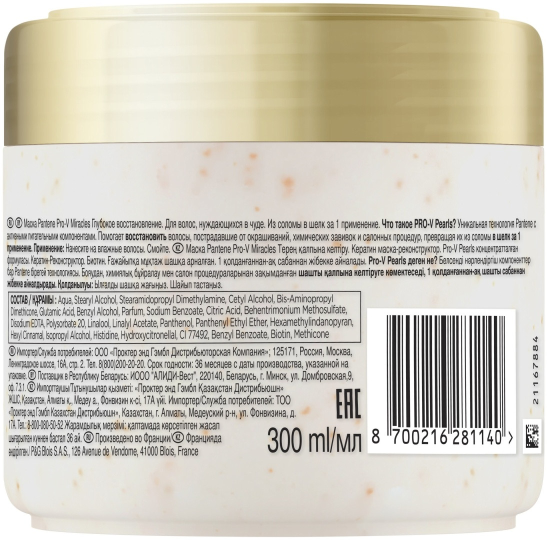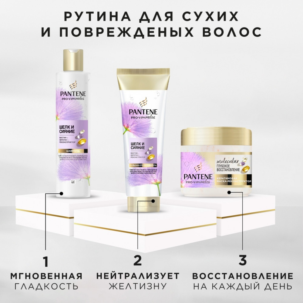 💳 Оплатить за товар можно при получении 🇰🇿 Есть бесплатная доставка по Казахстану от 1 дня 🎁 Копите бонусы с каждой покупки Серия: Miracles Pantene (Пантин) Pro-V Miracles — это высокопитательная формула Pro-V для волос, которые нуждаются в чуде. Коллекция Шелк и Сияние, созданная специально для сухих, поврежденных волос, пострадавших от окрашиваний и химических завивок, сочетает в себе силу уникального комплекса Pro-V с биотином и гидролизованным протеином шелка. Маска для волос восстанавливает сильно поврежденные, окрашенные или осветленные волосы, делая их сияющими и мягкими, как шелк. Ее формула, обогащенная биотином и протеинами шелками, помогает защитить волосы от повреждений во время укладки и сделать их более гладкими и послушными. |