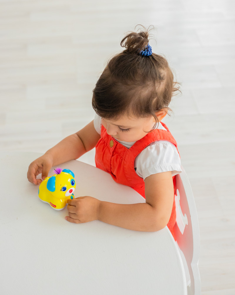 💳 Оплатить за товар можно при получении 🇰🇿 Есть бесплатная доставка по Казахстану от 1 дня 🎁 Копите бонусы с каждой покупки Серия: Веселые друзья Озорной щенок с пушистым чубчиком приведет малыша в восторг. А чубчик у него — волшебный! Нужно просто его погладить — и щенок заговорит! Нажимая на кнопочку, малыш послушает веселые песенки и мелодии («Я щенок забавный», «Питомцы», «Пляшут весело детишки», «Собачий вальс», «Чуку-чу»). А если погладить чубчик во время звучания — щенок будет подпевать. В игрушке также есть инерционный механизм — зверюшка ездит не хуже машинки. |