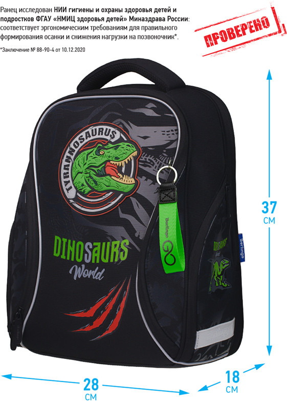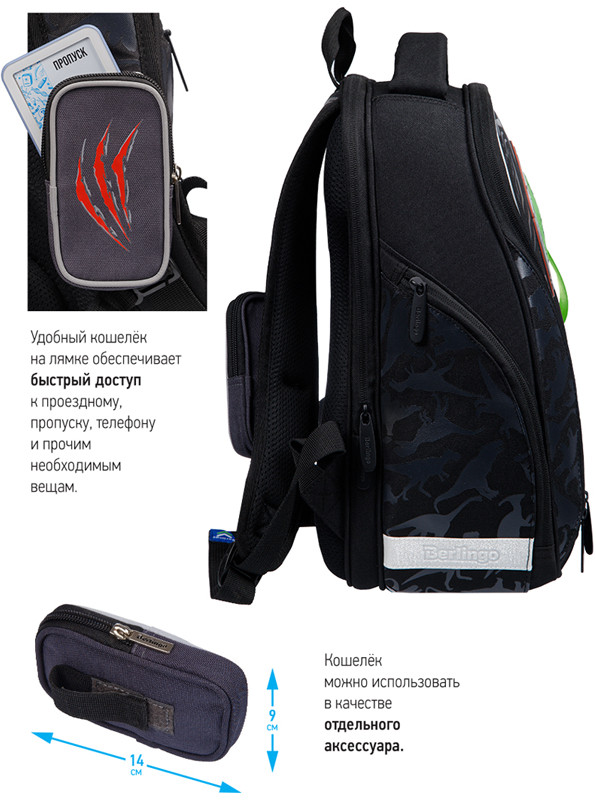 💳 Оплатить за товар можно при получении 🇰🇿 Есть бесплатная доставка по Казахстану от 1 дня 🎁 Копите бонусы с каждой покупки Серия: Nova Эргономичный ранец серии «Nova» для детей младшего и среднего школьного возраста выполнен из легкого экологичного ЭВА материала с покрытием из высокопрочной нейлоновой ткани кордура. За счет особой структуры нити в ней достигнута четырёхкратная стойкость к истиранию по сравнению с простым нейлоном. Кордура обладает водоотталкивающими свойствами и легко чистится. Благодаря анатомической вентилируемой спинке, регулируемым по длине лямкам и нагрудному креплению ранец плотно фиксируется на спине ребенка, что помогает равномерно распределить нагрузку и сохранить правильную осанку. Ранец имеет 2 отделения, 2 боковых кармана на молнии, съемный кошелек на лямке для быстрого доступа к необходимым вещам. Внутри предусмотрены разделители для учебных пособий, органайзер для письменных принадлежностей, карман для мобильного телефона, карабин для ключей и именная карточка для подписи. Отделение у спинки предназначено для учебных пособий формата А4+. Уплотненная мягкая ручка и петля для подвешивания к парте делают ранец очень удобным. Дно выполнено из водонепроницаемого материала с пластиковыми ножками для защиты содержимого от влаги. Световозвращающие элементы на лямках, передней и боковых частях ранца обеспечивают безопасность ребенка в темное время суток. |