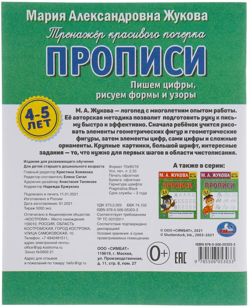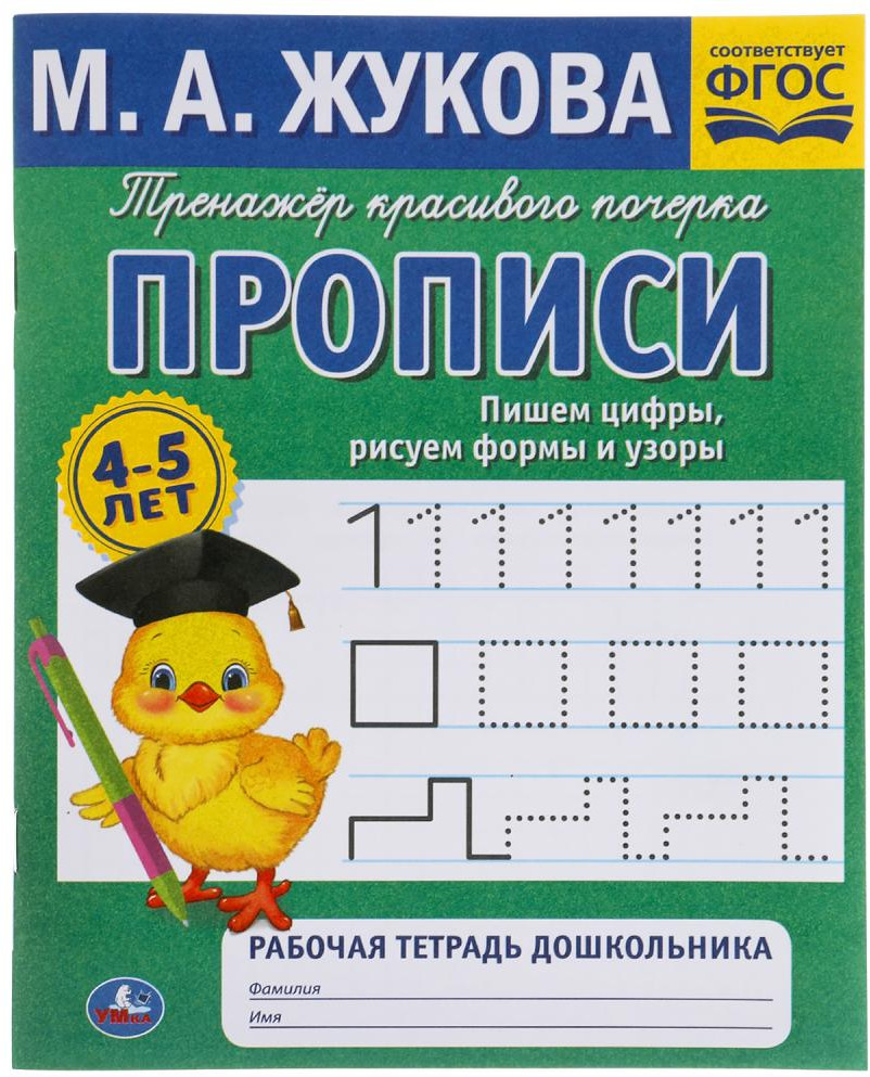 В данный момент этот товар отсутствует в продаже. Возможно, у нас найдется аналогичный или похожий товар здесь. Рабочая тетрадь дошкольника «М. А. Жукова. Пишем цифры, рисуем формы и узоры, 4-5 лет» ТМ «УМка» — настоящий тренажёр красивого почерка: