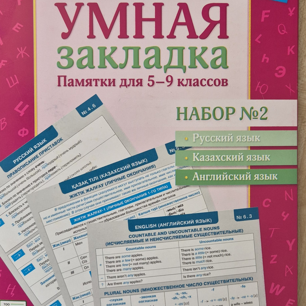 💳 Оплатить за товар можно при получении 🇰🇿 Есть бесплатная доставка по Казахстану от 1 дня 🎁 Копите бонусы с каждой покупки Серия: Золотая серия Данный набор карточек-памяток содержит справочную информацию по русскому, казахскому и английскому языкам в соответствии с учебной программой для 5–9 классов. |