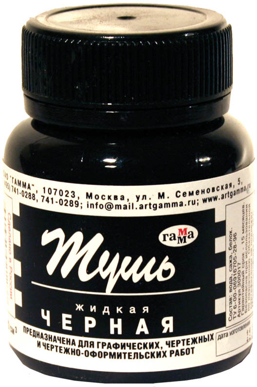 Тушь для графических, чертежных, чертежно-оформительских работ и каллиграфии. Сочетает яркость цветов и четкость линий. Оптимальная вязкость, легкость и удобство набора туши на рапидограф или рейсфедер. Устойчива к действию воды — достаточно промокнуть чертеж и тушь не растечется. Выдерживает температуру до −25°C.
