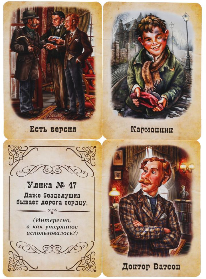 Игра настольная «Шерлок Холмс» упакована в чрезмерно большую для карточек такого размера коробочку, поэтому коробочка пришла в доставку частично порванная и помятая. Коробочка и карточки из тонкого картона. Карточки красивые, интересные по содержанию, отшлифованы (не ламинированы), однако для рук приятные. Карточек 18. Есть Правила игры. Мы укрепили помятую коробочку картоном добавочно, заклеили порванные места скотчем. Создали просто шедевр коробочки. возможно, коробочка предполагалась для карточек большого размера (как на картинке). А эти карточки - величиной с игральную карту. Мы положили в эту же коробочку ещё другую карточную игру "Шерлок Холм", чтобы заполнить пустоту. Снизила оценку за коробочку (надо бы и 3 поставить, но ведь сама-то игра интересная!).