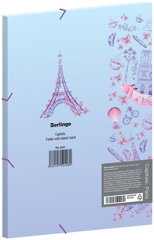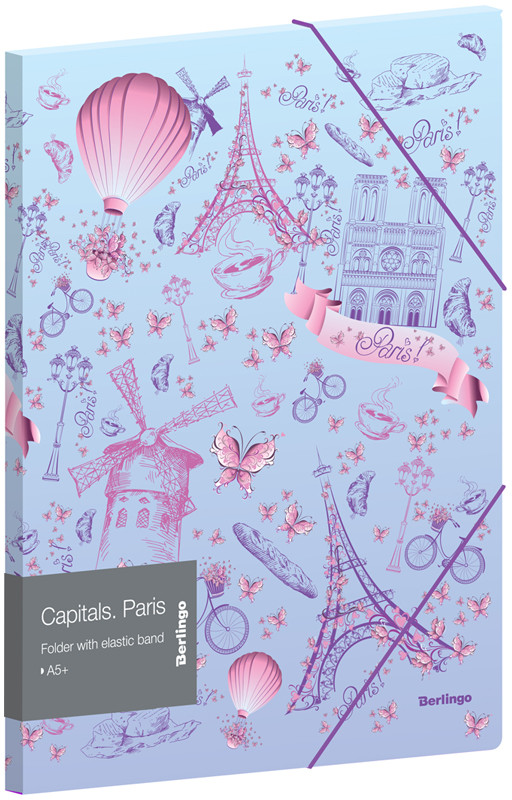 Папка пластиковая на резинках Berlingo «Capitals. Paris» формата А5+ с рисунком. Белый цвет внутренней поверхности. Надежные застежки-резинки фиолетового цвета. Быстрый доступ к содержимому. Изготовлена из высококачественного полипропилена с матовой текстурой поверхности «песок», на которой не видно отпечатков пальцев и мелких царапин. Предназначена для хранения тетрадей и документов. Толщина обложки 600мкм. Папка вмещает до 300 листов.