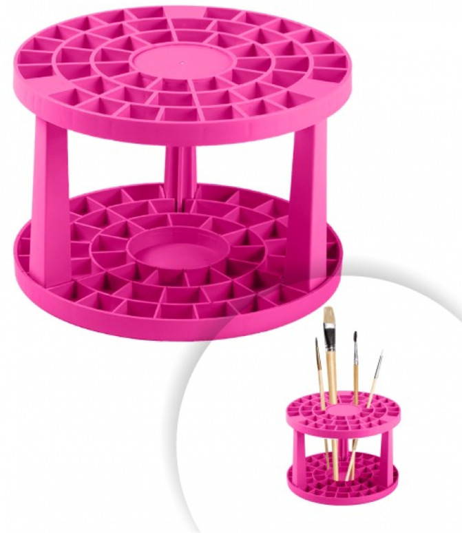 Удобная, компактная, практичная подставка. Кисти, карандаши, линеры, все под рукой. Только флейцевые кисти не подходят, до 1,5см диаметр ручки примерно должен быть. Очень довольна покупкой. Розовый цвет более сдержанный, чем на фото👍