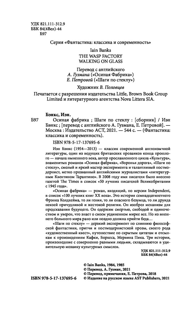 💳 Оплатить за товар можно при получении 🇰🇿 Есть бесплатная доставка по Казахстану 🎁 Копите бонусы с каждой покупки Серия: Фантастика: классика и современность Иэн Бэнкс (1954 — 2013) — классик современной англоязычной литературы, один из ведущих британских прозаиков конца прошлого — начала нынешнего века, автор прославленного цикла «Культура», знаменитых романов «Осиная фабрика», «Воронья дорога», «Шаги по стеклу», смелый и яркий мастер эксперимента и талантливый постмодернист, метко прозванный английскими журналистами «литературным Квентином Тарантино». В 2008 году имя писателя было внесено газетой The Times в список "50 лучших писателей Великобритании с 1945 года". |
