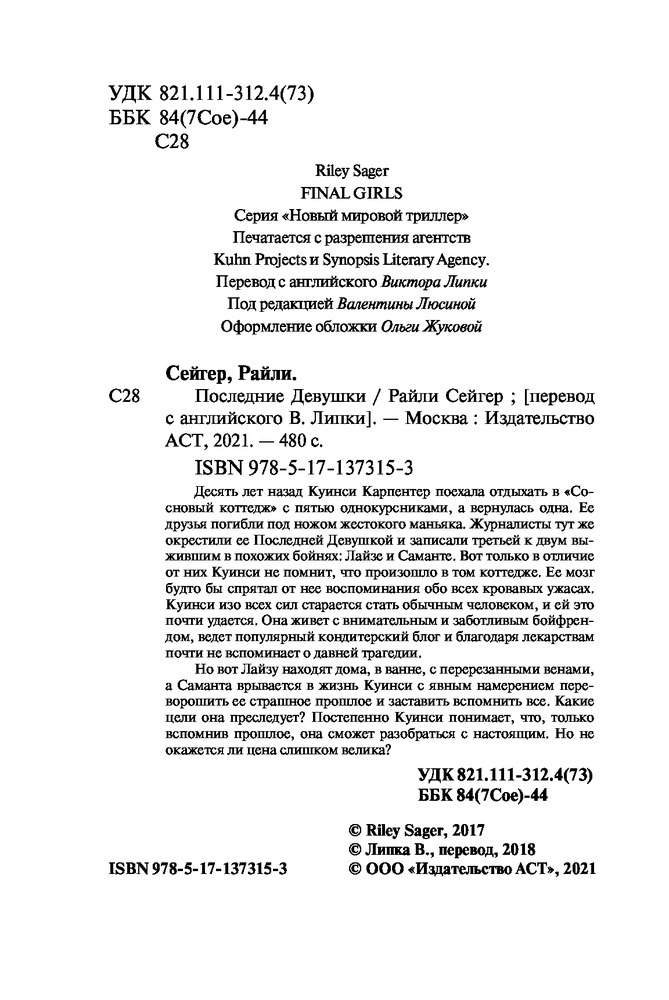 💳 Оплатить за товар можно при получении 🇰🇿 Есть бесплатная доставка по Казахстану от 1 дня 🎁 Копите бонусы с каждой покупки Серия: Новый мировой триллер (м) Десять лет назад Куинси Карпентер поехала отдыхать в «Сосновый коттедж» с пятью однокурсниками, а вернулась одна. Ее друзья погибли под ножом жестокого маньяка. Журналисты тут же окрестили ее Последней Девушкой и записали третьей к двум выжившим в похожих бойнях: Лайзе и Саманте. Вот только, в отличие от них, Куинси не помнит, что произошло в том коттедже. Ее мозг будто бы спрятал от нее воспоминания обо всех кровавых ужасах. Куинси изо всех сил старается стать обычным человеком, и ей это почти удается. Она живет с внимательным и заботливым бойфрендом, ведет популярный кондитерский блог и благодаря лекарствам почти не вспоминает о давней трагедии. |