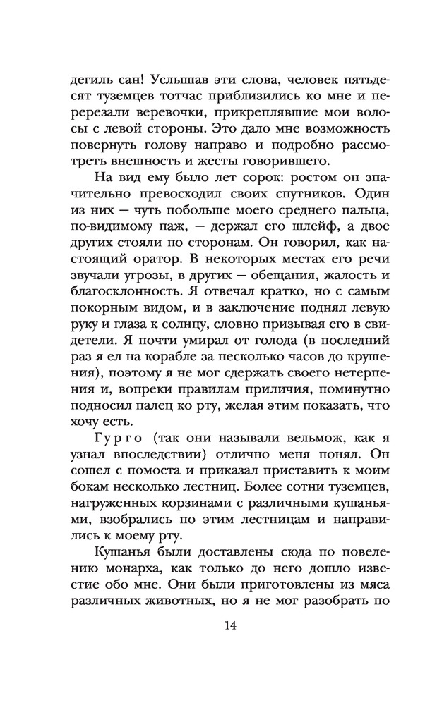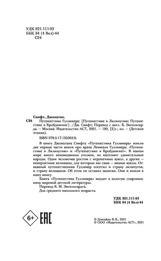 Путешествия ГулливераВ данный момент этот товар отсутствует в продаже. Возможно, у нас найдется аналогичный или похожий товар здесь. Серия: Детское чтение В книгу Джонатана Свифта «Путешествия Гулливера» вошли две первые части книги про врача Лемюэля Гулливера: «Путешествие в Лилипутию» и «Путешествие в Бробдингнег». В нашем мире много неизведанных уголков, их населяют удивительные народы. Одни человечки ростом с игрушечных кукол, а другие — невероятные великаны, для которых мы сами − живые куклы. Отважный путешественник Гулливер посетил и страну лилипутов, и страну великанов. Об этом он оставил записки. Они и вошли в нашу книгу. |