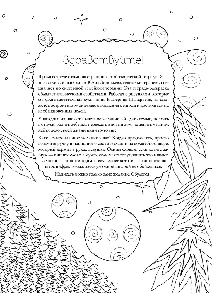 Счастливая раскраска от «счастливого психолога». Ваш путь к исполнению желанийВ данный момент этот товар отсутствует в продаже. Возможно, у нас найдется аналогичный или похожий товар здесь. Серия: Счастливый психолог У каждого из нас есть заветное желание. Создать семью, поехать в отпуск, родить ребенка, переехать в новый дом, поменять машину, найти дело своей жизни. Какое самое главное желание у вас? Подумайте... «Счастливый психолог» Юлия Зиновьева и художник Екатерина Шакарвене создали необычную СЧАСТЛИВУЮ раскраску. Она обладает магическими свойствами. Работая с рисунками в этом альбоме, вы сможете построить гармоничные отношения с миром и достичь самых необыкновенных целей. |