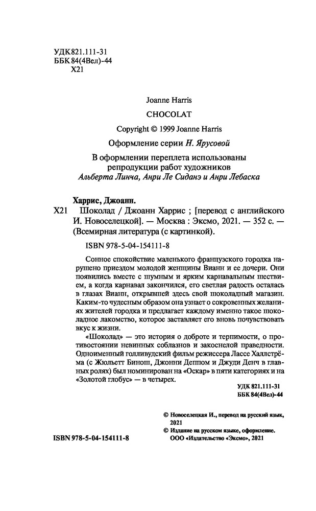 💳 Оплатить за товар можно при получении 🇰🇿 Есть бесплатная доставка по Казахстану от 1 дня 🎁 Копите бонусы с каждой покупки Серия: Всемирная литература (новое оформление) Сонное спокойствие маленького французского городка нарушено приездом молодой женщины Вианн и ее дочери. Они появились вместе с шумным и ярким карнавальным шествием, а когда карнавал закончился, его светлая радость осталась в глазах Вианн, открывшей здесь свой шоколадный магазин. Каким-то чудесным образом она узнает о сокровенных желаниях жителей городка и предлагает каждому именно такое шоколадное лакомство, которое заставляет его вновь почувствовать вкус к жизни. |