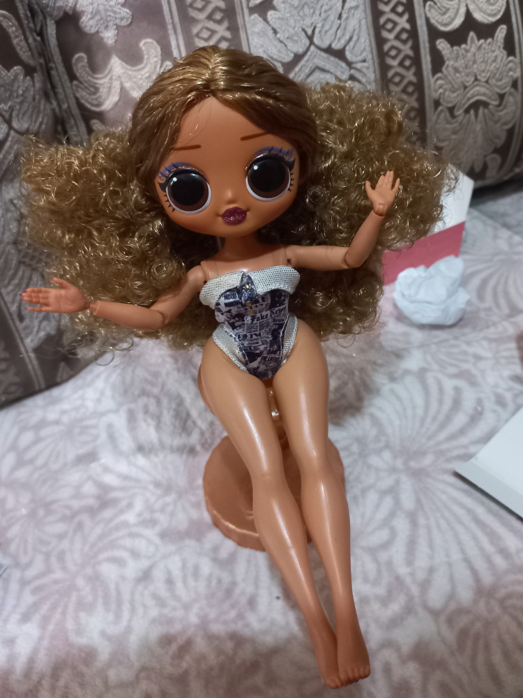 LOL OMG Da Boss из 3 серии фэнш кукол высотой 25 см. У нее длинные волнистые каштановые прошитые волосы и карие глаза. Da Boss одета в блестящий серебристый топ, пестрые расклешённые брюки и стильный золотистый пиджак. На ножках туфли с пестрым принтом. Кукла находится в упаковке в виде гардеробной комнаты, а комплекты одежды, обуви и аксессуаров спрятаны в чехлы для одежды, обувную и шляпную коробки. В наборе также есть подставка для куклы. В комплекте сестренка Boss Queen из 3 серии наборов Furniture с бутылочкой для питья.