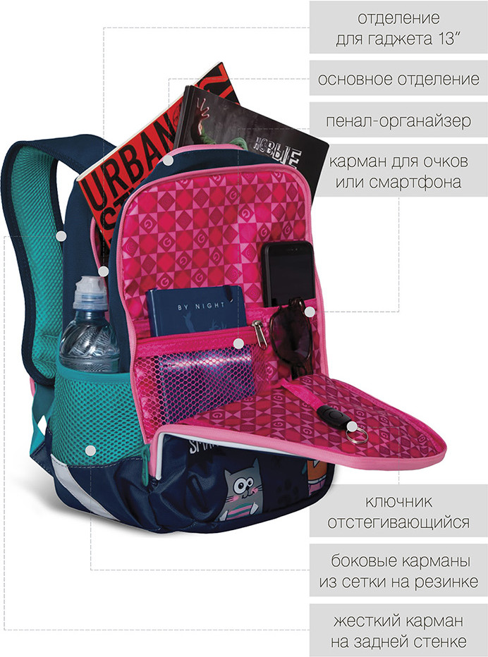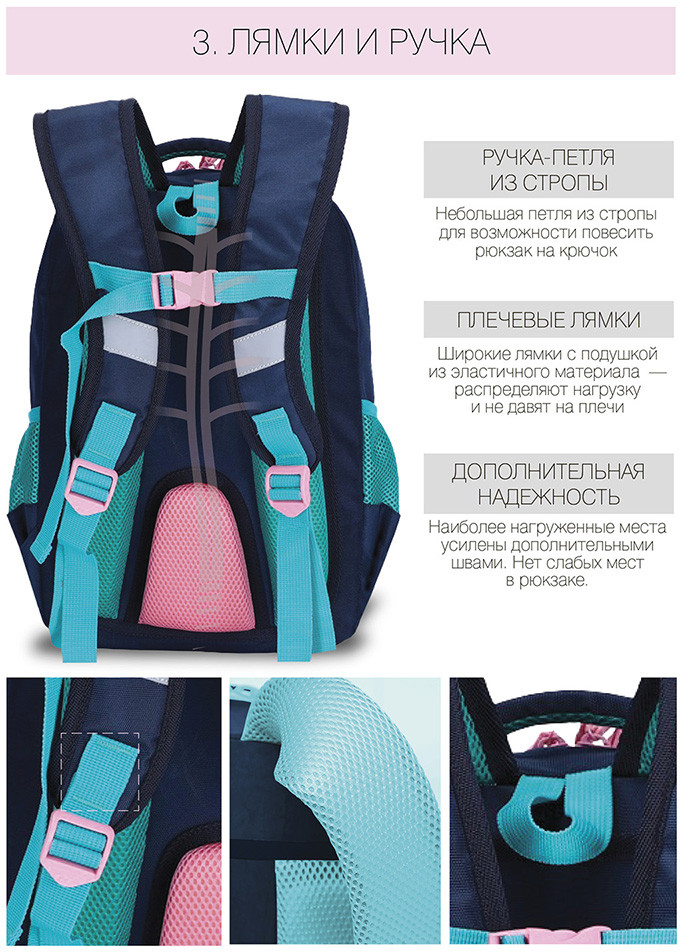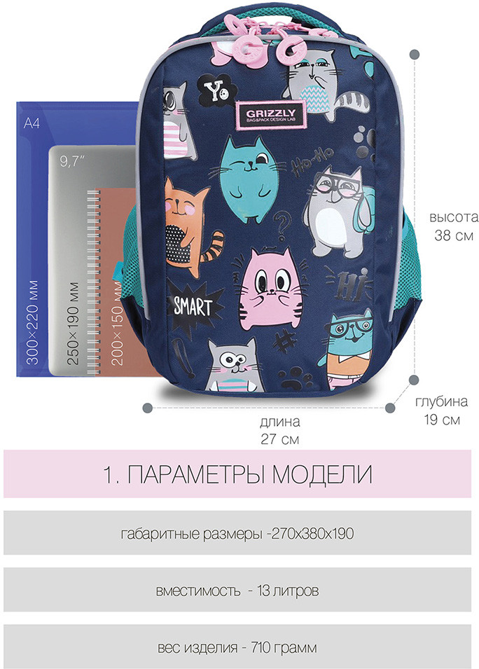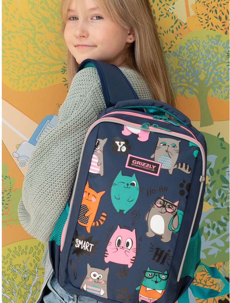 Замечательный рюкзак! Доча в восторге, первый класс. Все очень качественно, гризли топовая фирма в России, ни разу не пожалела что заказала его. Спинка и лямки удобны, разгружают спину ребенку. Очень даже вместительный. Ништячков много, кармашков, верёвочек для ключей