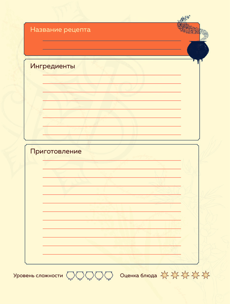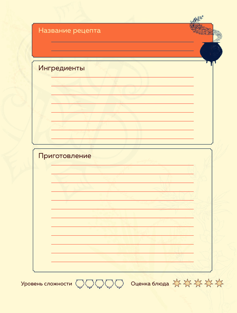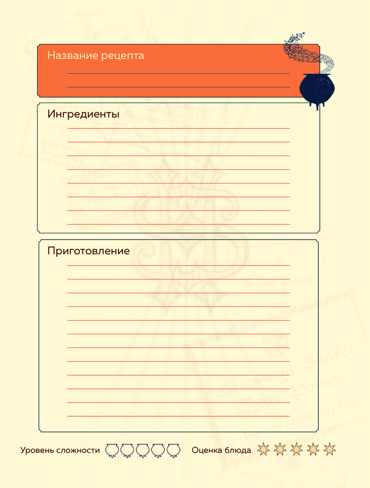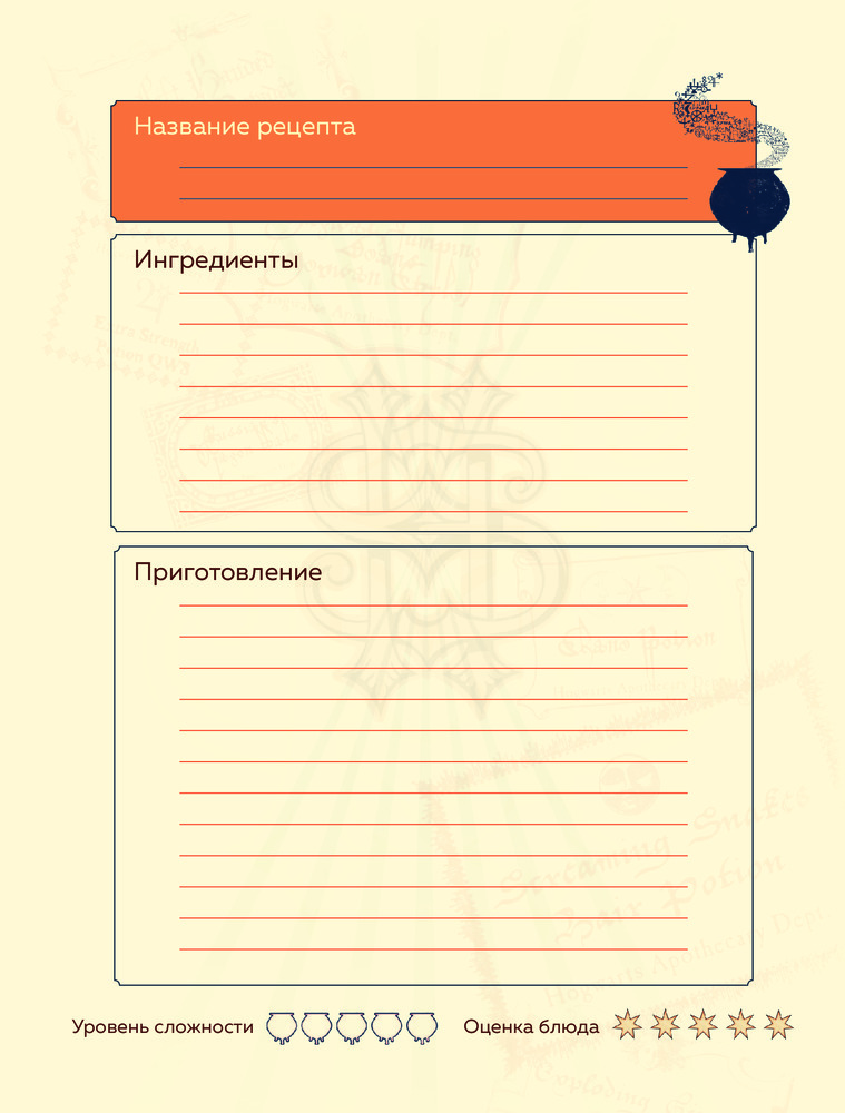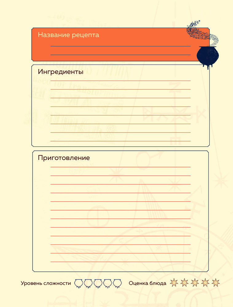 Гарри Поттер. Блокнот для записи рецептовВ данный момент этот товар отсутствует в продаже. Возможно, у нас найдется аналогичный или похожий товар здесь. Серия: Вселенная Harry Potter/ Гарри Поттер ЛЮМОС! Новый формат прямиком из легендарной вселенной Мальчика-который-выжил — магический блокнот для записи рецептов! Вместе с ним вы сможете устроить собственный Рождественский пир, ничуть не уступающий пиру в Хогвартсе! Внутри вы найдете функциональную сетку с местом для записи названия блюда, ингредиентов и способов приготовления, а также яркие иллюстрации из волшебной вселенной на каждом развороте. Удобный формат А5 позволит записывать рецепты на весу, а твердая обложка с эксклюзивным дизайном защитит ваши рецепты от всего — не понадобится даже волшебная палочка! Отличный подарок для поклонников! |