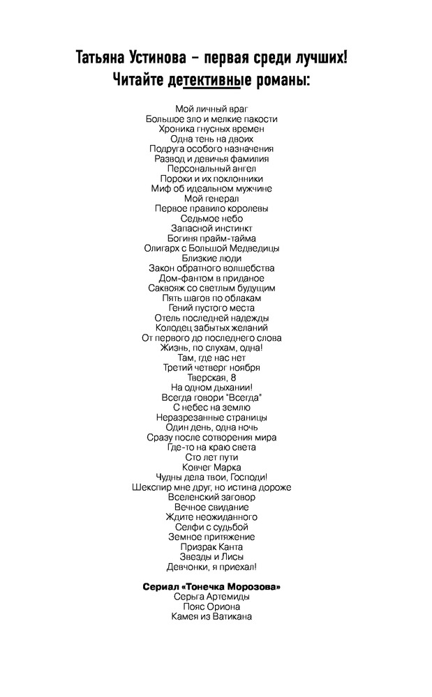 В данный момент этот товар отсутствует в продаже. Возможно, у нас найдется аналогичный или похожий товар здесь. Серия: Татьяна Устинова. Первая среди лучших После внезапной трагической смерти отца юная Надинька осталась круглой сиротой. Она потеряла еще и дом, в котором жила всю жизнь. Теперь у нее есть только верная няня Агаша и любимый Сереженька.