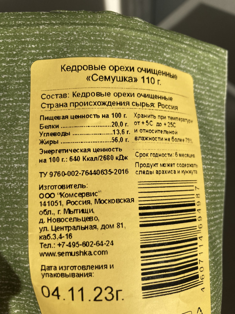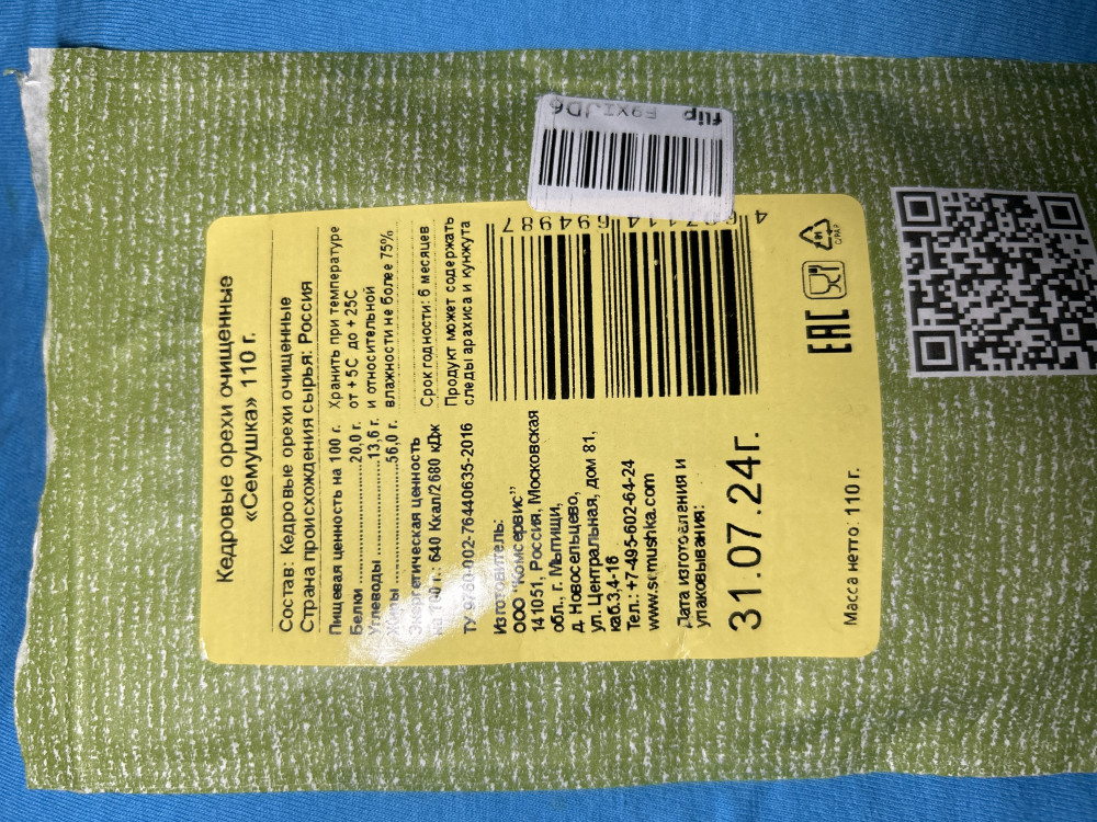 Орешки чистые, без затхлого запаха. В упаковке 110 г