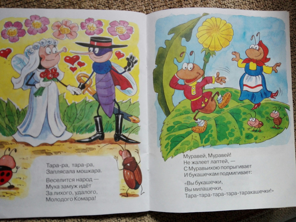 Отличная книжка! Милые и добрые иллюстрации, прекрасные стихи. Однозначно стоит купить, тем более за такую цену. Погрешности состоят в незнании художником анатомии членистоногих, у героев не хватает лапок. Паук изображен всего с 6-ю лапками, а насекомые с 2-мя. И еще неодинаково количество цветов в букете у невесты. Но книжка всё равно приятная, рекомендую.