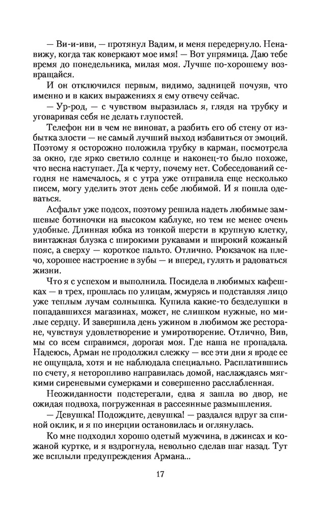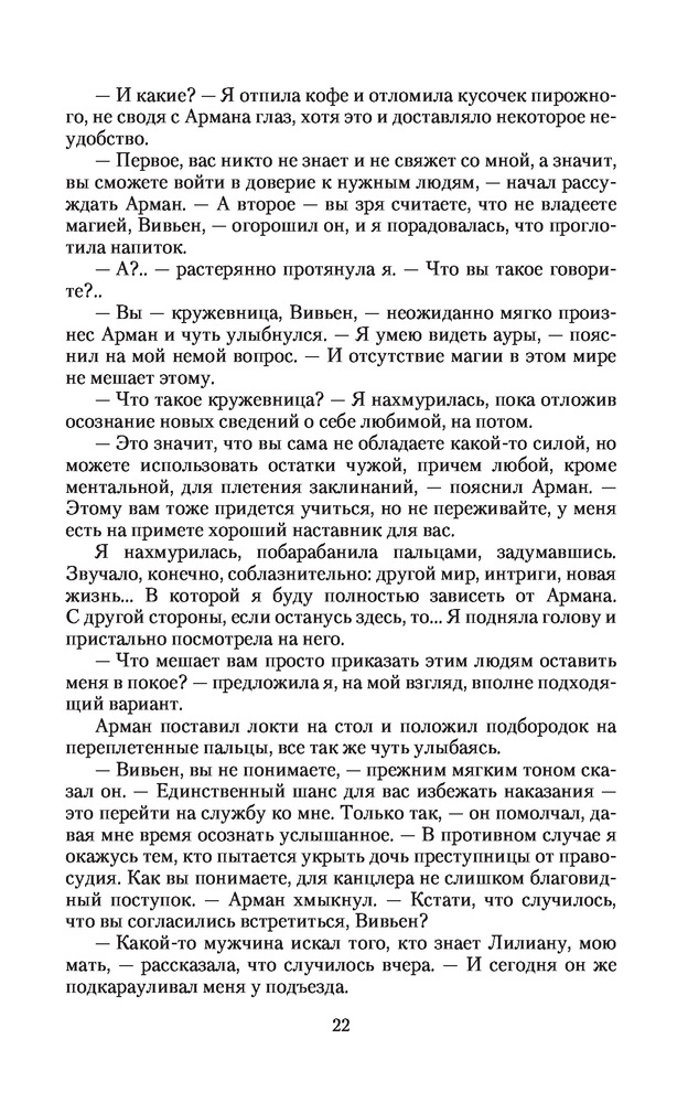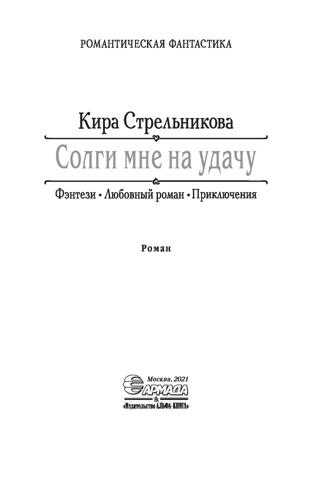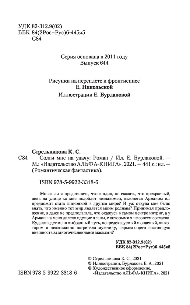 Солги мне на удачуВ данный момент этот товар отсутствует в продаже. Возможно, у нас найдется аналогичный или похожий товар здесь. Серия: Романтическая фантастика Могла ли я представить, что в один, не сказать, что прекрасный, день на улице ко мне подойдет незнакомец, назовется Арманом и... предложит стать шпионкой в другом мире? И уж откуда мне было знать, что именно тот мир является моим родным? Принимая предложение, я даже не предполагала, что окажусь в самом центре интриг, а у Армана на меня далеко идущие планы, с которыми я не совсем согласна. Куда заведет меня выбранный путь, непредсказуемый и опасный, на котором я неожиданно встретила мужчину, скрывающего настоящую внешность за многочисленными масками? |