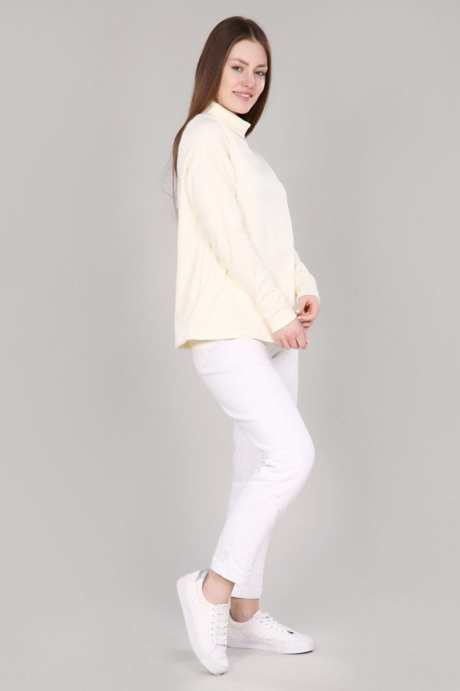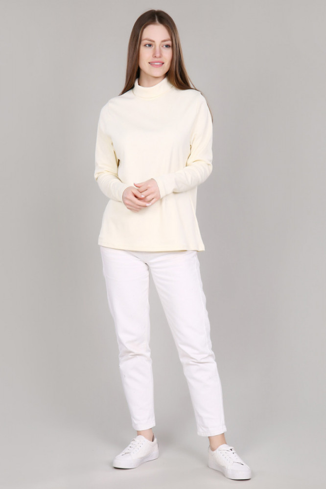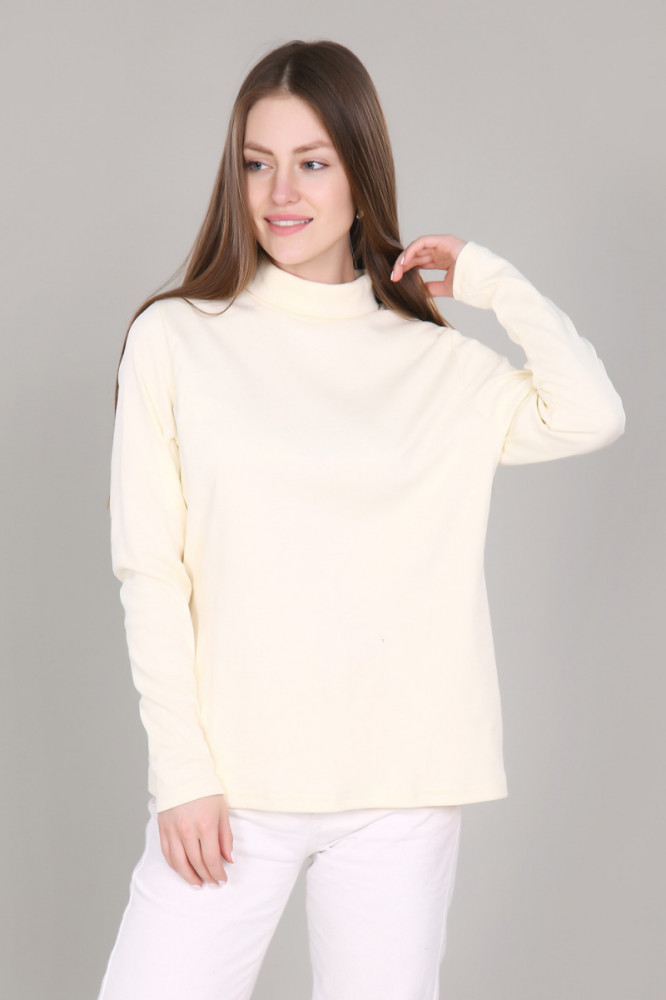 Водолазка отличного качества (экрю, на самом деле бледно жёлтый, приятный), но описание не соответствует реальности. Силуэт приталенный, узкие рукава носить было бы не комфортно, хотя размер мой, 50р. Хотела то, что заявлено в описании и на фото. Подарила подруге.