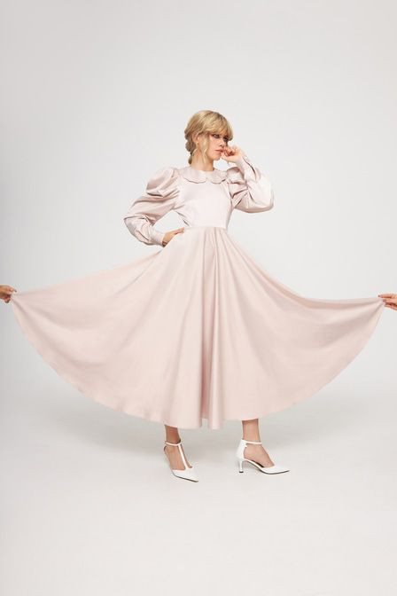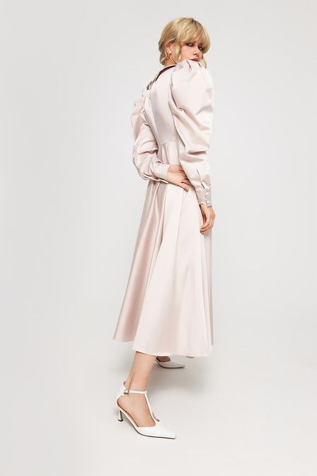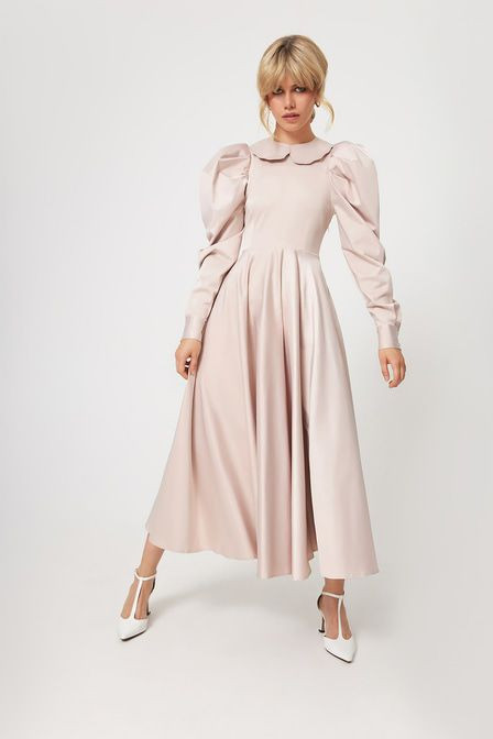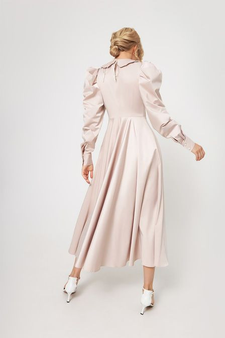 Атласное платье приталенного кроя выполнено из смесового хлопка — плотного, эластичного, приятного к телу материала, который отличается высокой прочностью и износостойкостью. Модель дополнена объемными рукавами со складками на плечах и съемным акцентным воротником. Приталенный крой подчеркивает силуэт. Застежка-молния сбоку. Съемный воротник с завязками.