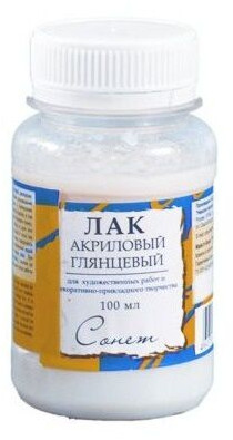 Акриловый лак, прозрачный, глянцевый. Не имеет запаха. После нанесения быстро высыхает (скорость высыхания зависит от температуры окружающего воздуха), образует блестящее покрытие. Лак хорошо ложится на разные материалы: картон, дерево, пенопласт, в том числе на материалы, покрашенные акриловыми красками. Полезные советы: если нужно покрыть лаком ровную плоскую поверхность, лучше чтобы поверхность была влажной (можно предварительно нанести на поверхность воду кисточкой тонким слоем), тогда лак ляжет ровнее, лакированная поверхность получится более гладкой. Хорошо, чтобы поверхность, покрытая лаком, во время высыхания располагалась горизонтально. При необходимости лак можно наносить в 2 или более слоёв. После работы баночку с лаком нужно плотно закрыть, а кисточки, которыми наносился лак, промыть водой.