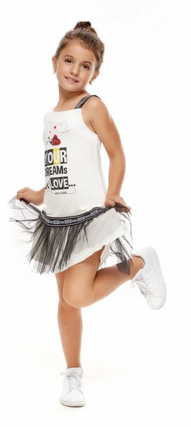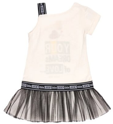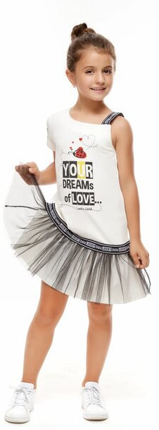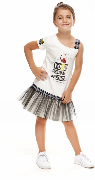 Необычное платье с заниженной талией. Сразу же внимание привлекает юбочка с фатином. Это очень красиво. Рукава тоже с изюминкой: один рукав втачной, вместо второго – бретелька из жаккардовой ленты. Маленькие модницы точно оценят такой наряд.