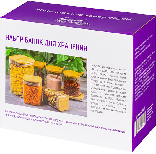 Elan Gallery Набор банок для хранения «Crystal glass»легкие вместительные красивые качественные В данный момент этот товар отсутствует в продаже. Возможно, у нас найдется аналогичный или похожий товар здесь. Серия: Crystal glass Набор состоит из 2-х банок Crystal glass объемом 1,1 литра каждая. Банки выполнены из боросиликатного стекла и имеют крышки из натурального бамбука. Подходят для хранения риса, гречки, фасоли, муки, кофе и самых разнообразных продуктов. Стеклянные банки позволяют легко определить содержимое, экономя ваше время и позволяя вовремя пополнять запасы. Стильно выглядят и подходят для организации хранения даже на открытых полках. Крышки плотно закрываются благодаря силиконовым прокладкам. Размер каждого изделия 10×10×15,5 см. Хранить вертикально. Крышки нельзя замачивать. Банки без крышек можно использовать в микроволновой печи и посудомоечной машине. Поставляются в стильной картонной упаковке. Банки Crystal glass смогут стать удобным дополнением на кухне или приятным подарком для ваших родных и близких! |