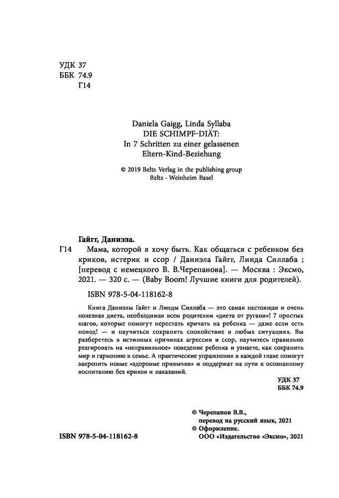 💳 Оплатить за товар можно при получении 🇰🇿 Есть бесплатная доставка по Казахстану 🎁 Копите бонусы с каждой покупки Серия: Baby Boom! Лучшие книги для родителей Книга Даниэлы Гайгг и Линды Силлаба — это самая настоящая и очень полезная диета, необходимая всем родителям: «диета от ругани»! 7 простых шагов, которые помогут перестать кричать на ребенка — даже если есть повод! — и научиться сохранять спокойствие в любых ситуациях. Вы разберетесь в истинных причинах агрессии и ссор, научитесь правильно реагировать на «неправильное» поведение ребенка и узнаете, как сохранить мир и гармонию в семье. А практические упражнения в каждой главе помогут закрепить новые «здоровые привычки» и поддержат на пути к осознанному воспитанию без криков и наказаний. |