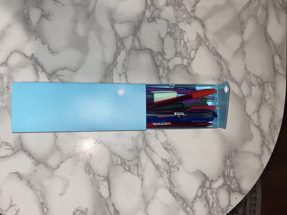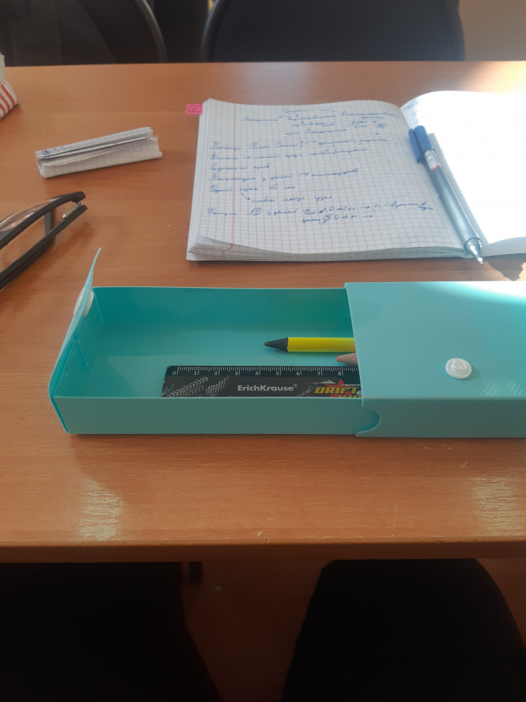 Очень практичный пенал: приятный цвет, хороший пластик . Все необходимое вмещается, кроме линейки 20см, но не критично.