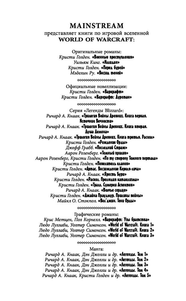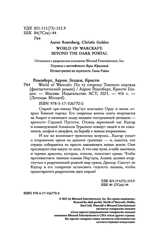 World of Warcraft. По ту сторону Темного порталаКристи Голден, Аарон Розенберг В данный момент этот товар отсутствует в продаже. Возможно, у нас найдется аналогичный или похожий товар здесь. Серия: Легенды Blizzard Старый орк-шаман Нер`зул возглавил Орду и вновь открыл Темный портал. Его свирепые воины опять вторгаются на Азерот и начинают осаду недавно построенной цитадели — крепости Стражей Пустоты. Отсюда верховный маг Кадгар и командующий Альянсом Туралион поведут людей и их союзников, эльфов и дворфов, на борьбу с новым вторжением. |