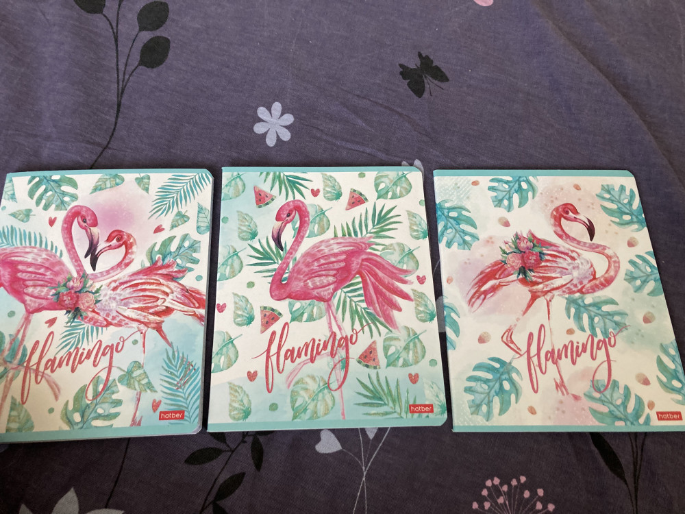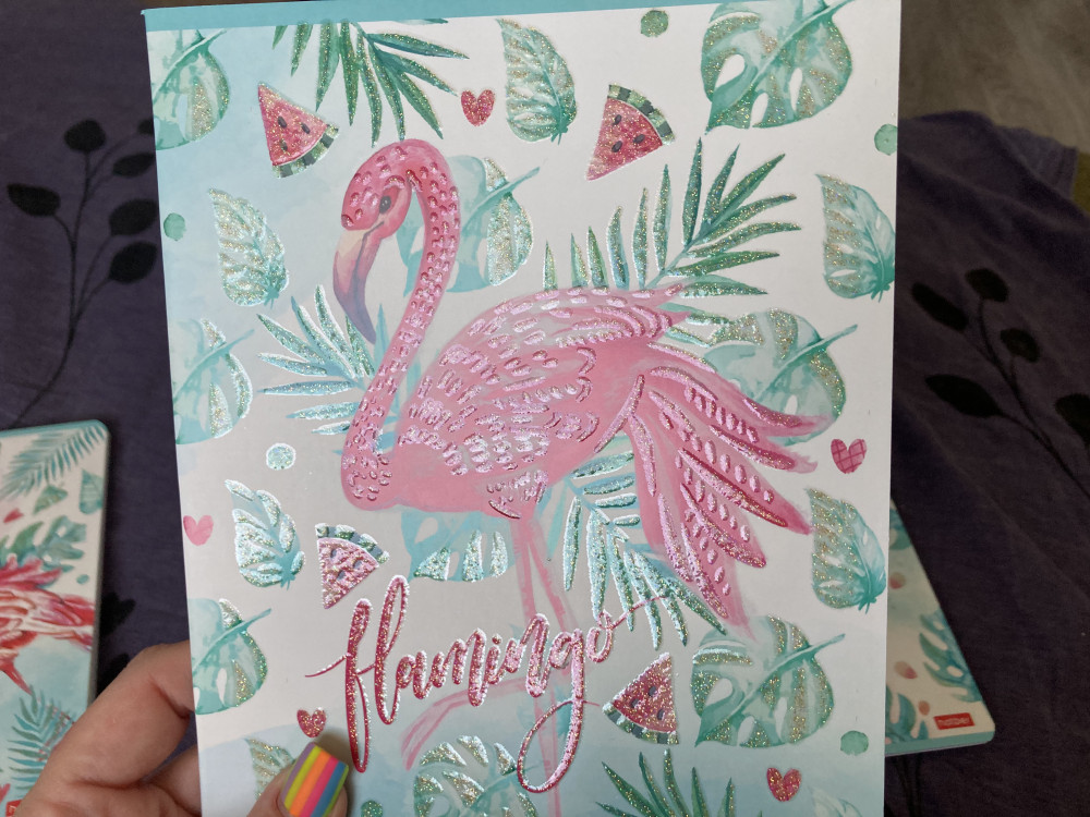 Хорошие тетради. На обложке блестки. Рисунки разные но все с фламинго