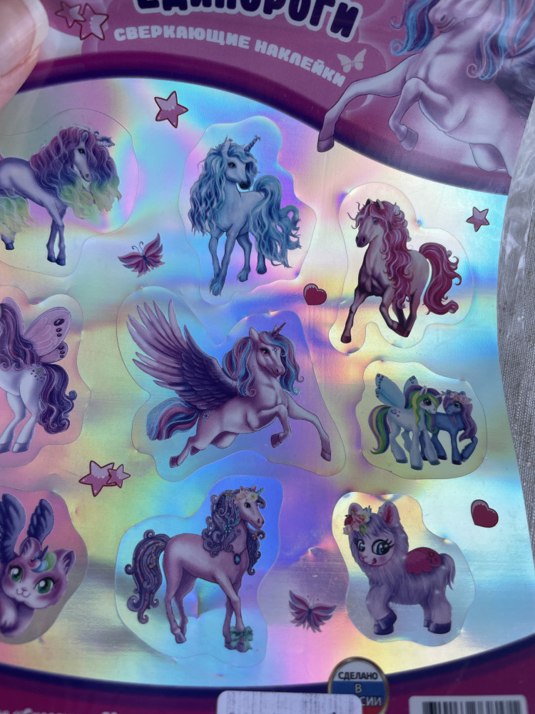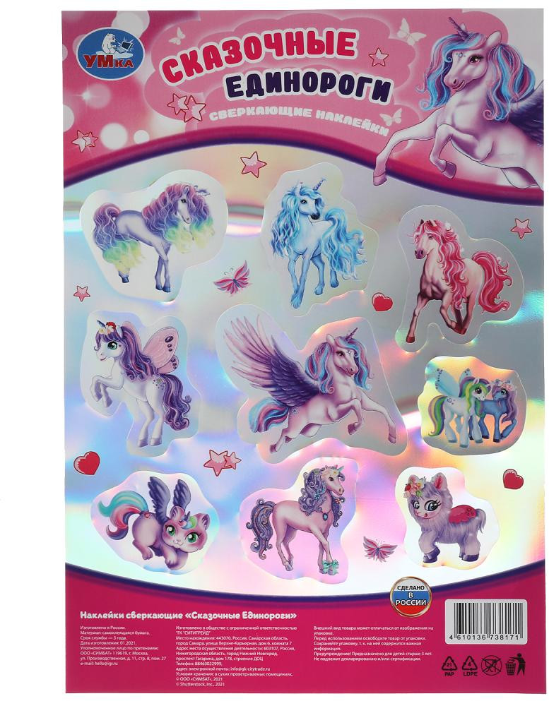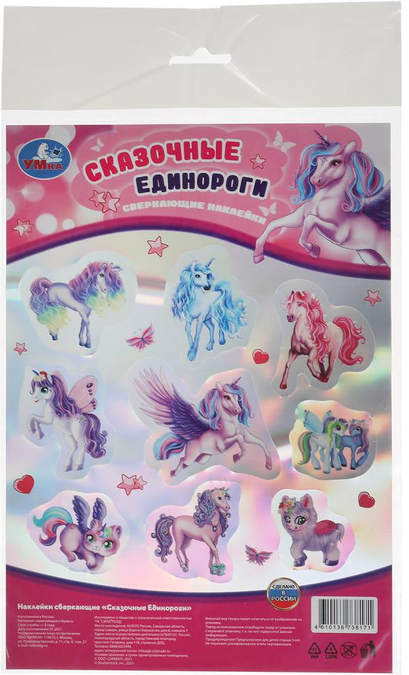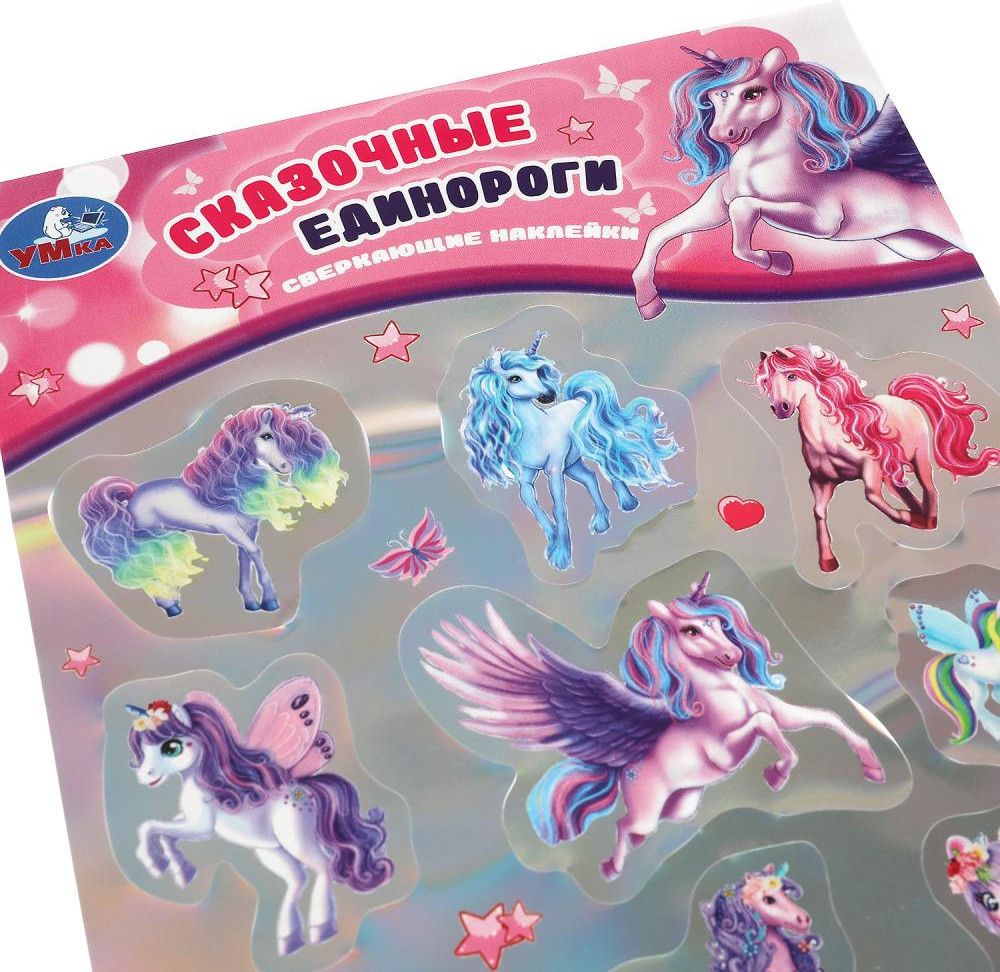 УМка Наклейки сверкающие «Сказочные единороги»В данный момент этот товар отсутствует в продаже. Возможно, у нас найдется аналогичный или похожий товар здесь. Сверкающие наклейки «Сказочные единороги» ТМ «УМка» непременно понравятся маленьким принцессам. Ребёнок с удовольствием будет приклеивать красиво переливающиеся на свету стикеры с изображением прекрасных единорогов на альбомы и тетради, создавая на бумаге свои собственные интересные истории с их участием. Благодаря компактному формату наклейки удобно брать с собой в дорогу. |
