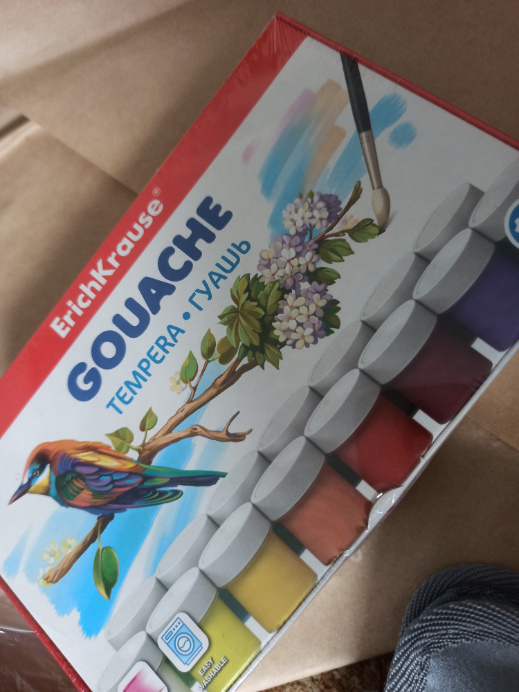 Гуашь получила немного подсохшую. А некоторые баночки были совсем с высохшей краской. Пришлось реанимировать срочно самостоятельно, при помощи горячей воды и перемешивания, так как краска нужна ребёнку на занятия сегодня. Высохшую краску тоже постараюсь растворить за ночь, если не получится, то придётся выкинуть.🤦♀️