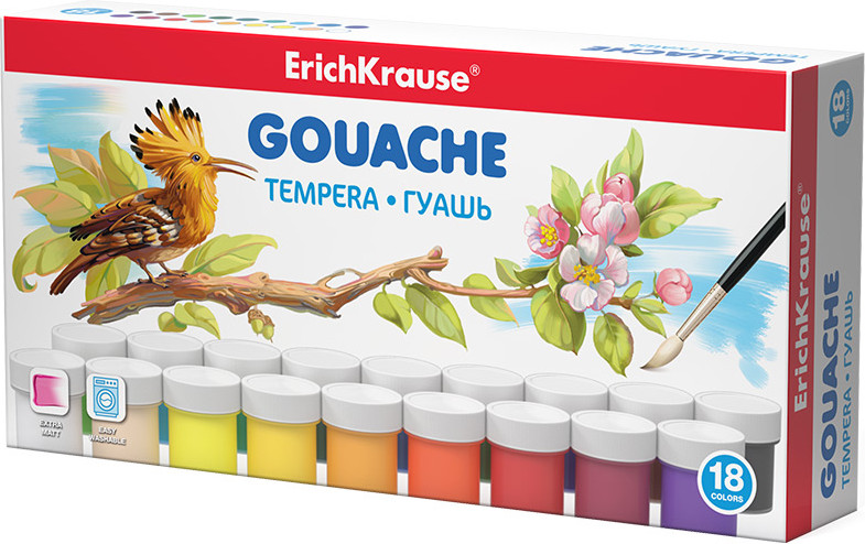 Гуашь отличает высокая кроющая способность краски. Цвета насыщенные, глубокие, отлично перекрываются и образуют экстра матовую бархатистую поверхность по мере высыхания краски. При этом сохраняется яркость и насыщенность тона, краски ложатся ровно, не осыпаются. Хорошо разводится и размывается водой, легко набирается на кисть.