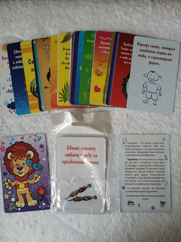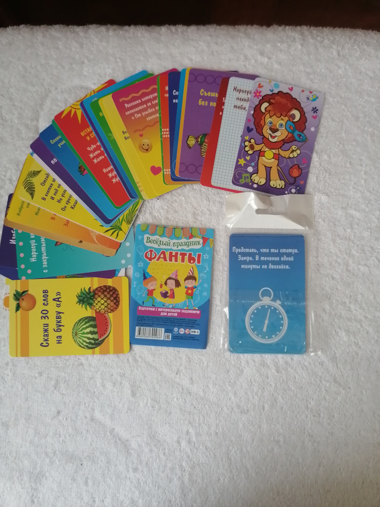 Балл снизила из-за отсутсвия коробки у данной игры. А так мне очень понравились фанты. Маленькие (5,5*8,8см), яркие, красочные, гладкие карточки, реально для праздников.