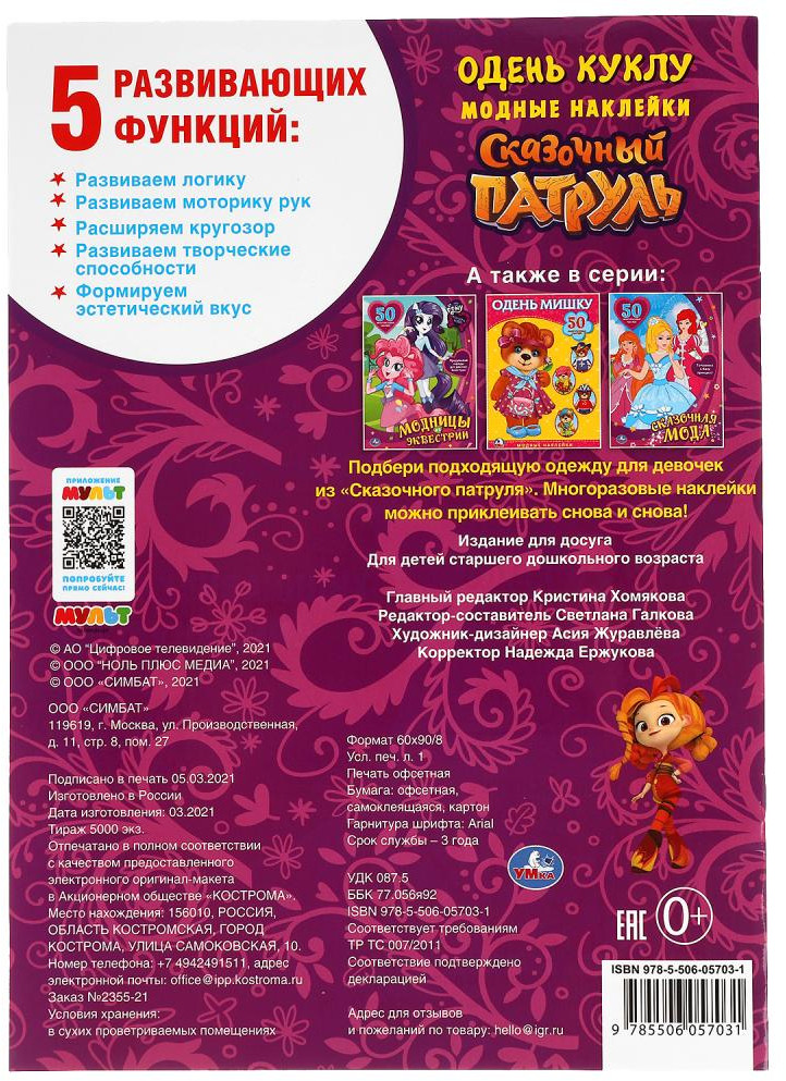 УМка Сказочный патруль. Одень куклуВ данный момент этот товар отсутствует в продаже. Возможно, у нас найдется аналогичный или похожий товар здесь. Серия: Модные наклейки Эта красочная активити-книжка предлагает ребёнку нарядить героев популярного мультсериала «Сказочный патруль». Яркие многоразовые наклейки можно приклеивать снова и снова, пробуя совершенно разные образы. Удобный формат позволяет брать книгу с собой в дорогу. Занятия с набором развивают внимание, память, фантазию, воображение, координацию движений, усидчивость и мелкую моторику рук. Готовят руку к письму, расширяют кругозор, учат различать цвета и раскрашивать. |