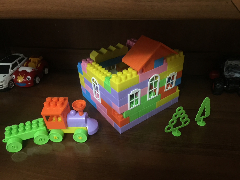 Моей 2-летней дочке очень понравился данный конструктор, очень удобный в использовании, однако стоит отметить, что не хватает деталей для конструирования поезда, как нарисовано на картинке