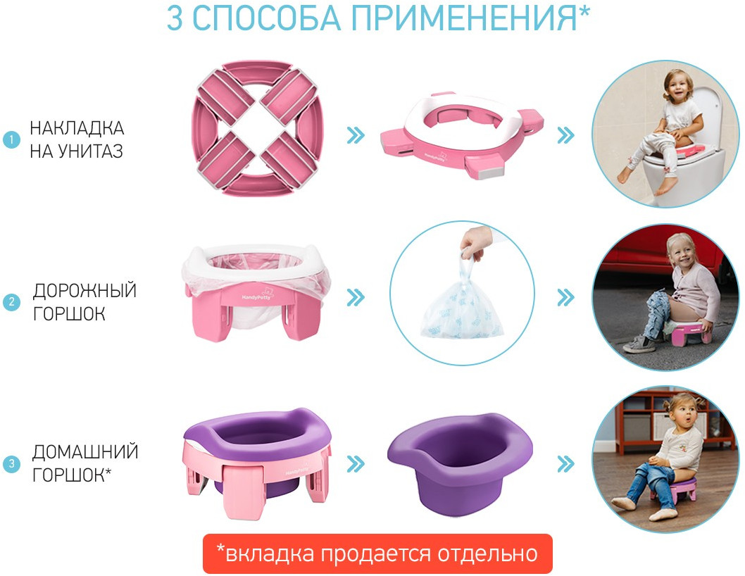 Прогулки и путешествия с ребенком станут намного комфортнее с дорожным горшком «HandyPotty». Это простое приспособление сочетает в себе функции трех аксессуаров: обычного горшка, дорожного горшка и адаптера для унитаза, что позволяет использовать «HandyPotty» длительное время.