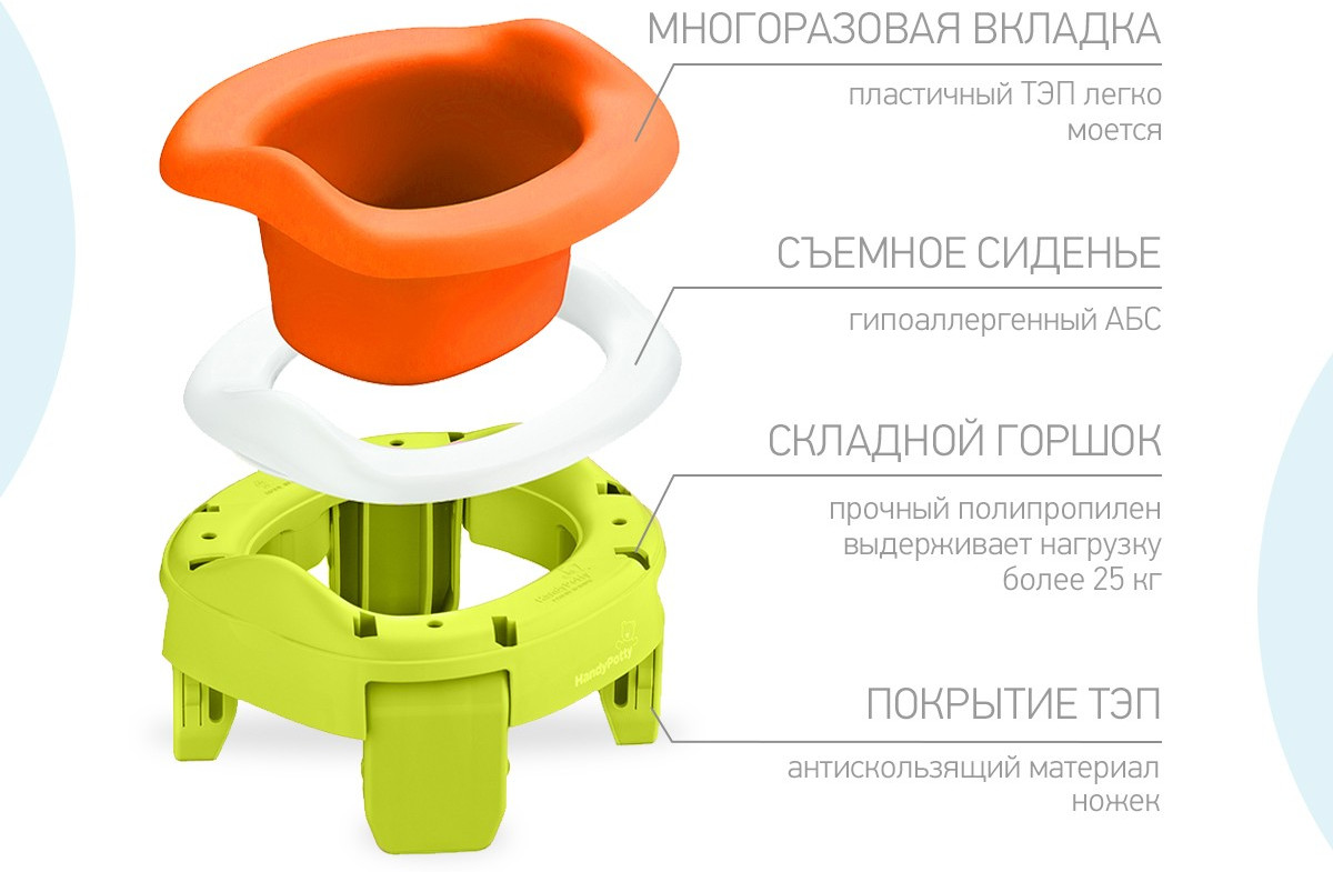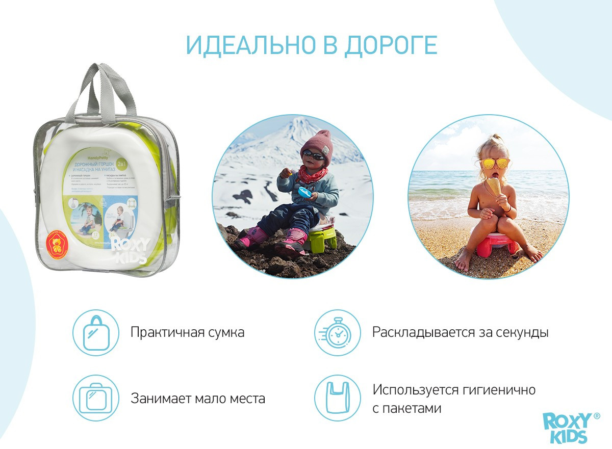 ROXY-KIDS Горшок детский дорожный 3 в 1 «Handy Potty»В данный момент этот товар отсутствует в продаже. Возможно, у нас найдется аналогичный или похожий товар здесь. Складной горшок «Handy Potty» поможет обеспечить дополнительный комфорт в путешествиях с маленькими детьми. Это простое приспособление сочетает в себе функции трех аксессуаров: обычного горшка, дорожного горшка и адаптера для унитаза, что делает горшок «Handy Potty» универсальным. В комплекте с этой моделью поставляется многоразовая вкладка. |