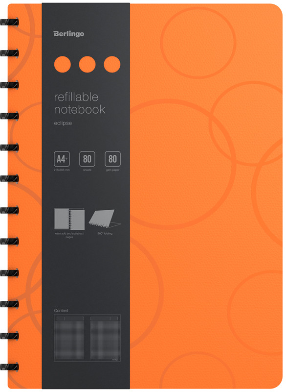 Бизнес-тетрадь Berlingo «Eclipse» — это практичное, стильное и современное изделие для планирования и записей. Такая бизнес-тетрадь является незаменимым инструментом для деловых людей. Увеличенная толщина обложки. Насыщенный коралловый цвет внешней стороны в сочетании с изящной фактурой в виде глянцевых пересекающихся окружностей. Контрастный яркий бирюзовый цвет внутренней поверхности. Материал обложки — трехслойный пластик, надежно защищает внутренний блок от влаги, замятия и загрязнения, обложка устойчива к загрязнениям. Вид скрепления — стильные имиджевые черные кольца, с возможностью раскрывать тетрадь на 360⁰. Возможна замена бумажного блока и быстрая и удобная выемка/вставка листов без повреждений.