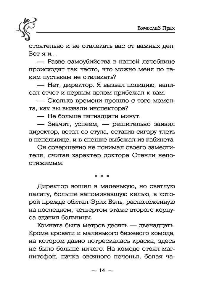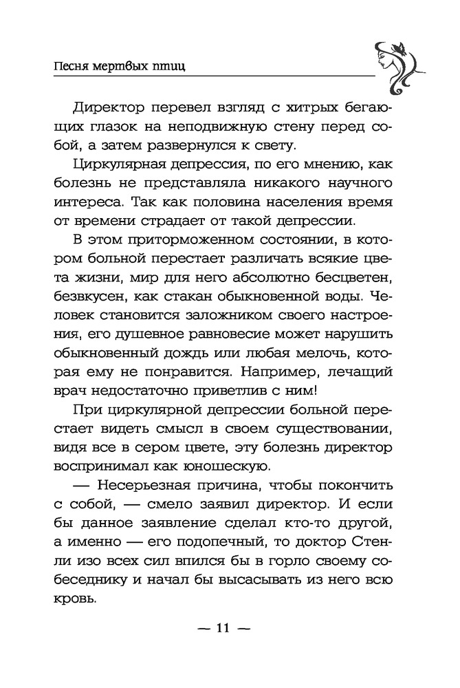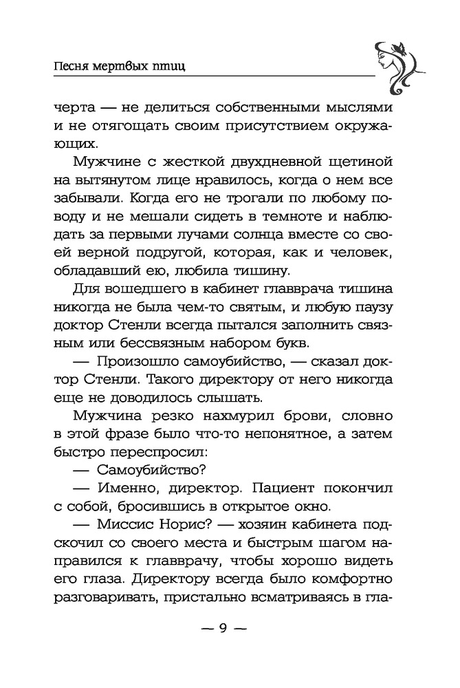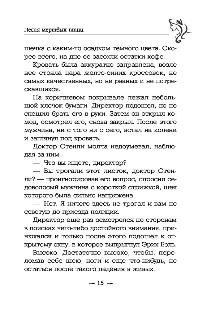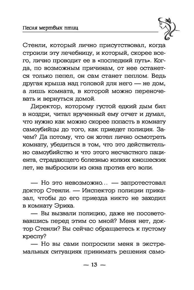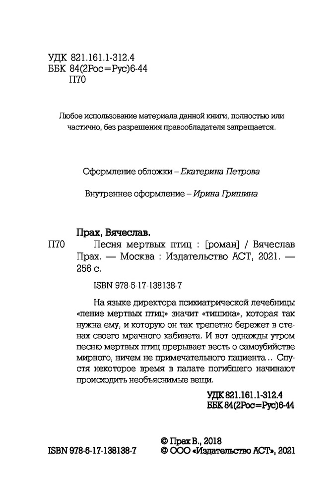 В данный момент этот товар отсутствует в продаже. Возможно, у нас найдется аналогичный или похожий товар здесь. Серия: Кофейня. Бестселлеры Вячеслава Праха На языке директора психиатрической лечебницы «пение мёртвых птиц» значит «тишина», которая так нужна ему и которую он так трепетно бережёт в стенах своего мрачного кабинета. И вот однажды утром песню мёртвых птиц прерывает весть о самоубийстве мирного, ничем не примечательного пациента... Спустя некоторое время в палате погибшего начинают происходить необъяснимые вещи.