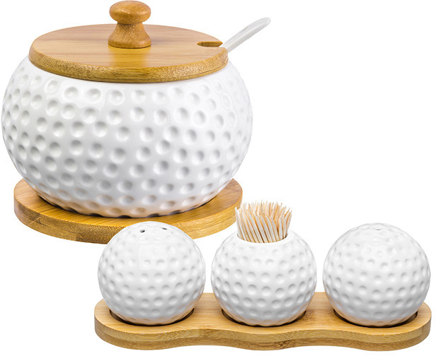 Elan Gallery Сахарница с набором для специй «Сфера»В данный момент этот товар отсутствует в продаже. Возможно, у нас найдется аналогичный или похожий товар здесь. Серия: Сфера Набор серии «Сфера» состоит из сахарницы, солонки, перечницы и вазочки под зубочистки на деревянной подставке. Набор выполнен из высококачественного фарфора и натурального бамбука. Емкости для специй и вазочка под зубочистки выполнены в форме сфер. Емкости для специй снизу имеют отверстия для наполнения, которые закрываются пластиковыми пробками. Фарфоровые детали набора можно мыть в посудомоечной машине. Бамбуковую подставку нельзя замачивать. Набор для специй из серии посуды «Сфера» сможет стать настоящим украшением кухни или приятным подарком для ваших родных и близких! |
