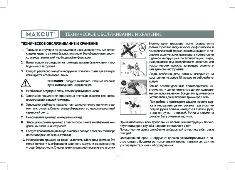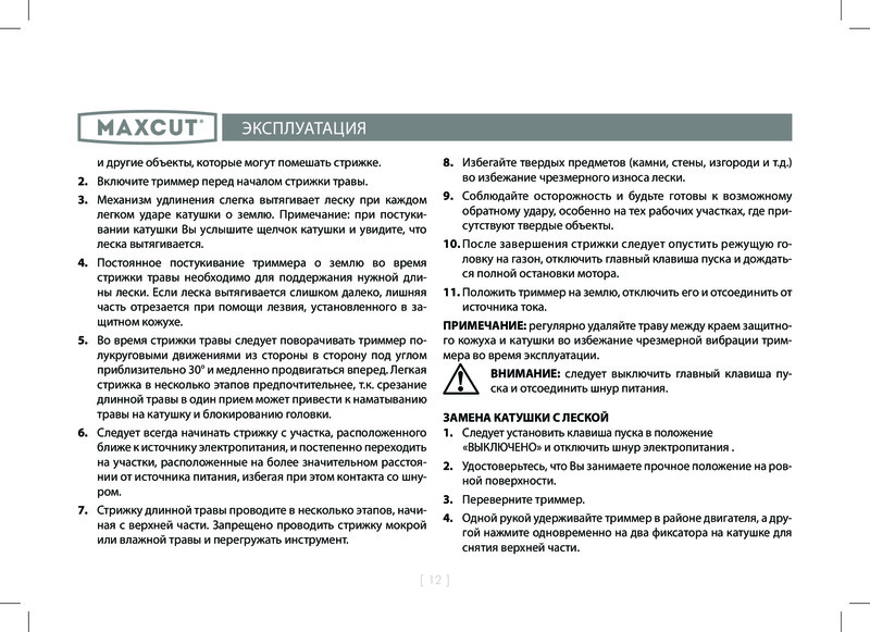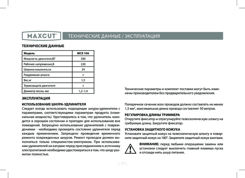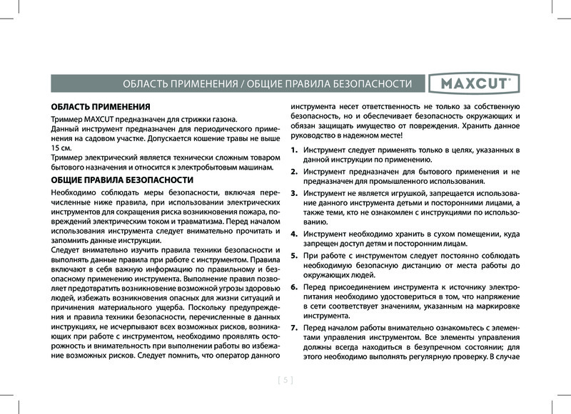 Maxcut Триммер электрический Maxсut MCE 106В данный момент этот товар отсутствует в продаже. Возможно, у нас найдется аналогичный или похожий товар здесь. Триммер электрический Maxсut MCE 106 предназначен для скашивания травы на небольших частных участках. Надежность. Выполнен из устойчивого к механическим повреждениям и ударам пластика. Разборная конструкция гарантирует компактную транспортировку и хранение агрегата. Триммер отличается небольшим весом и оснащен локтевой опорой, что обеспечивает комфортное использование пожилыми людьми и женщинами. |