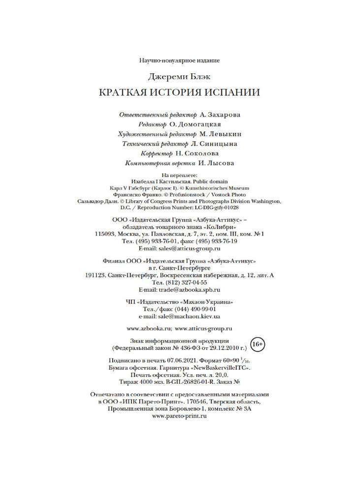 💳 Оплатить за товар можно при получении 🇰🇿 Есть бесплатная доставка по Казахстану от 1 дня 🎁 Копите бонусы с каждой покупки Серия: Города и люди Краткая история Испании от ранних поселений, владычества Рима и арабского завоевания Пиренейского полуострова до возрождения Испании в XVII веке, войны на полуострове и революции в Испанской Америке, катастрофической Гражданской войны и тоталитарного режима Франко, Второй мировой войны и далее, до наших дней. Освещая главные вехи, включая христианскую Реконкисту, плавания Колумба, колонизацию Кубы, Филиппин и Пуэрто-Рико, правление Габсбургов и проведенную Бурбонами централизацию, затрагивая темы влияния Великой французской революции и Наполеоновских войн, падения монархии в 1930-х годах и многие другие, Джереми Блэк уделяет пристальное внимание самобытности регионов Испании, дает прогнозы на будущее, а также характеризует векторы культурного развития и общемирового влияния Испании в литературе, изобразительном искусстве, музыке и других сферах. |