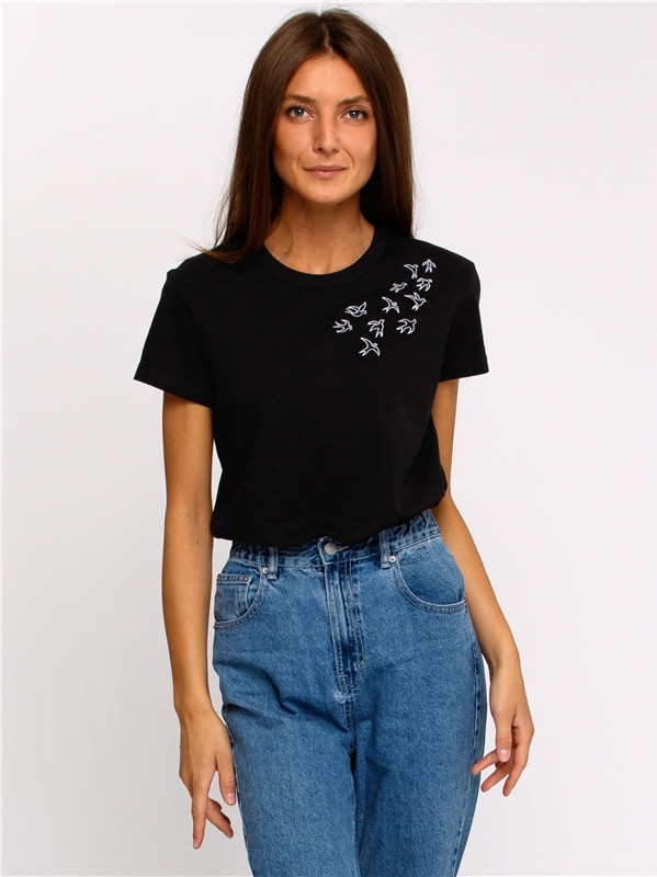 Футболка хорошего качества, птички на плече - вышивка, очень красиво смотрится. Размер-в размер, но я взяла на размер больше, всё равно со временем подсядет. Берите, не пожалеете!