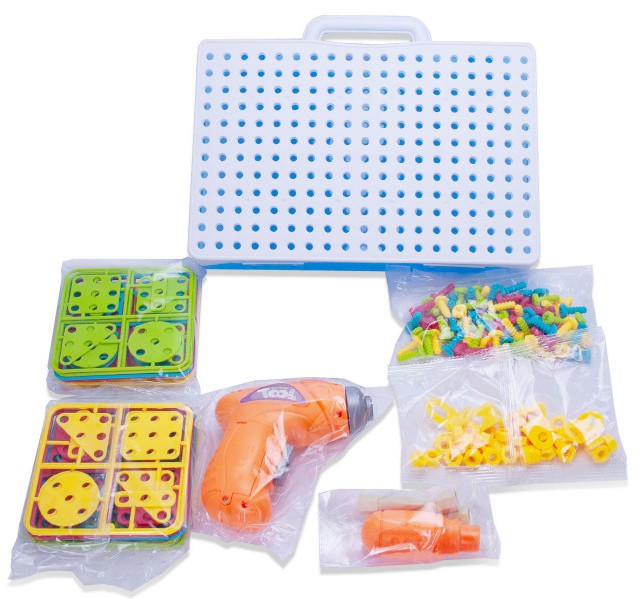 Развивающий детский конструктор 3D с дрелью 2-х режимов (+3 насадки) и 249 ярких деталей с болтами в чемодане! Новинка. Новые детали, крупная мозаика. На рабочую поверхность закрепляем карточки и ребенок уже может легко раскрашивать картинки мозаикой разного цвета и размера или вкручивать болтики и детали. |