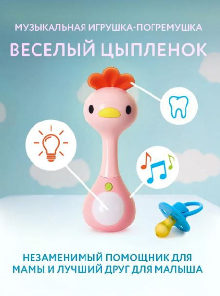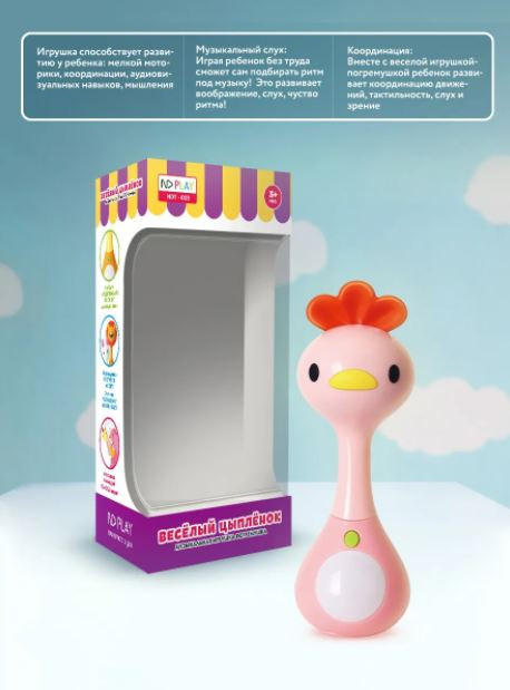 ND Play Игрушка музыкальная «Веселый Цыпленок»В данный момент этот товар отсутствует в продаже. Возможно, у нас найдется аналогичный или похожий товар здесь. Меня зовут Веселый Цыпленок, и я незаменимый помощник для мамы и лучший друг для малыша. Со мной можно не только играть. Я могу проигрывать различные мелодии и светиться в такт с музыкой. А ещё я знаю разные звуки окружающего мира. Если меня потрясти, я буду издавать различные звуки и светиться от радости. У меня волшебные ушки, сделанные из мягкого и безопасного силикона, которые можно грызть. |