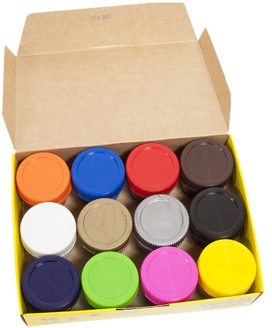 Краски легко смываются с рук и одежды. Безвредны для здоровья ребёнка при использовании по назначению. Изготовлены на основе натуральных компонентов и высококачественных пигментов. В набор входят 2 необычных цвета: золотой и серебряный, а также 10 классических цветов.