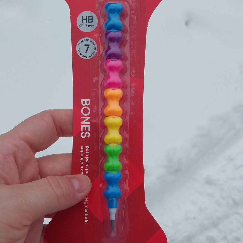 отличный сегментный карандаш. можно брать даже на подарок, красивая упаковка, веселый дизайн. есть прозрачный колпачок, чтобы стержень не ломался пока хранится.