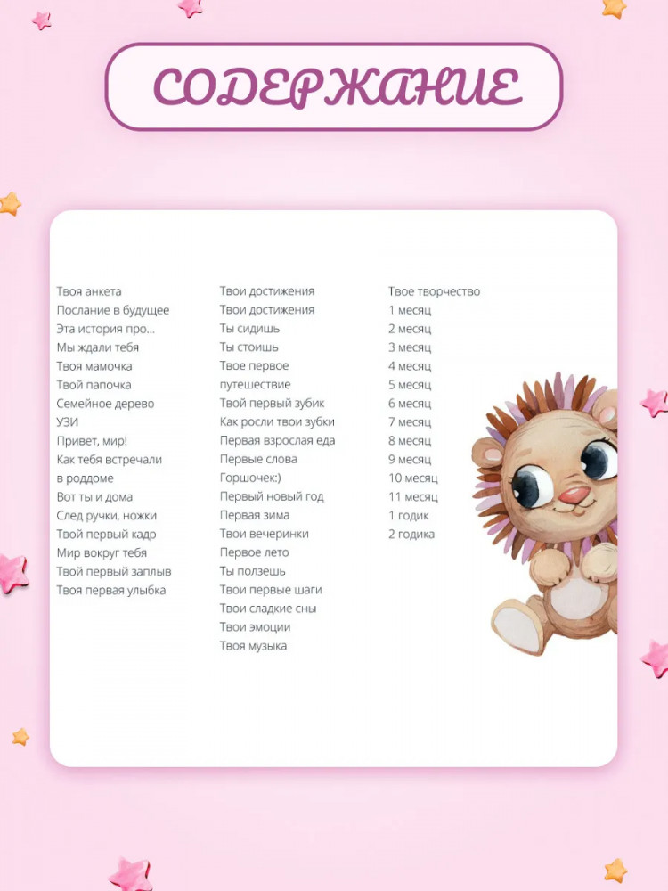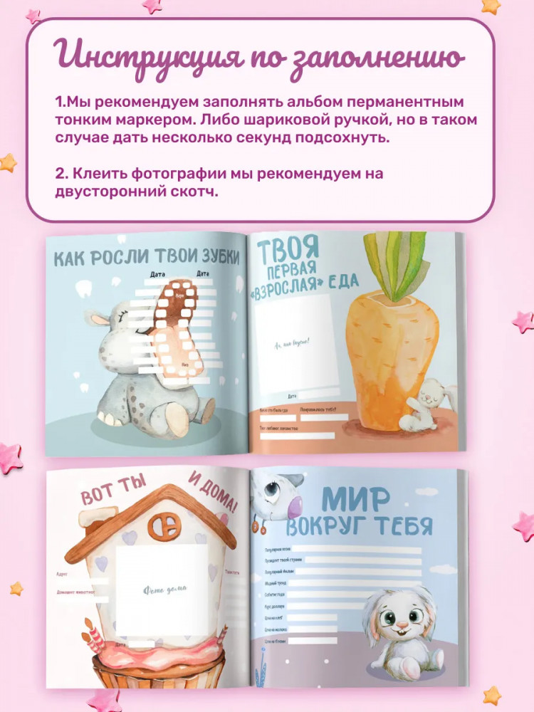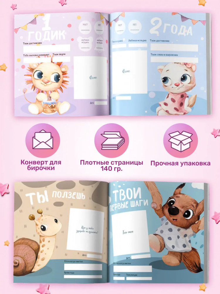 Отличный именной альбом для мальчика (именной фотоальбом для девочки) с авторскими иллюстрациями, приятной на ощупь обложкой из премиального материала, цветными и яркими картинками, удобным и читабельным шрифтом, качественно прошитыми страницами, лаконичным дизайном. Вы сохраните приятные и незабываемые моменты вашего ребенка в таком прекрасном альбоме для детей: снимки УЗИ, встреча из роддома, первая анкета, первое купание, первая улыбка, первые шаги, первые зубки и первая еда и даже первый горшок.